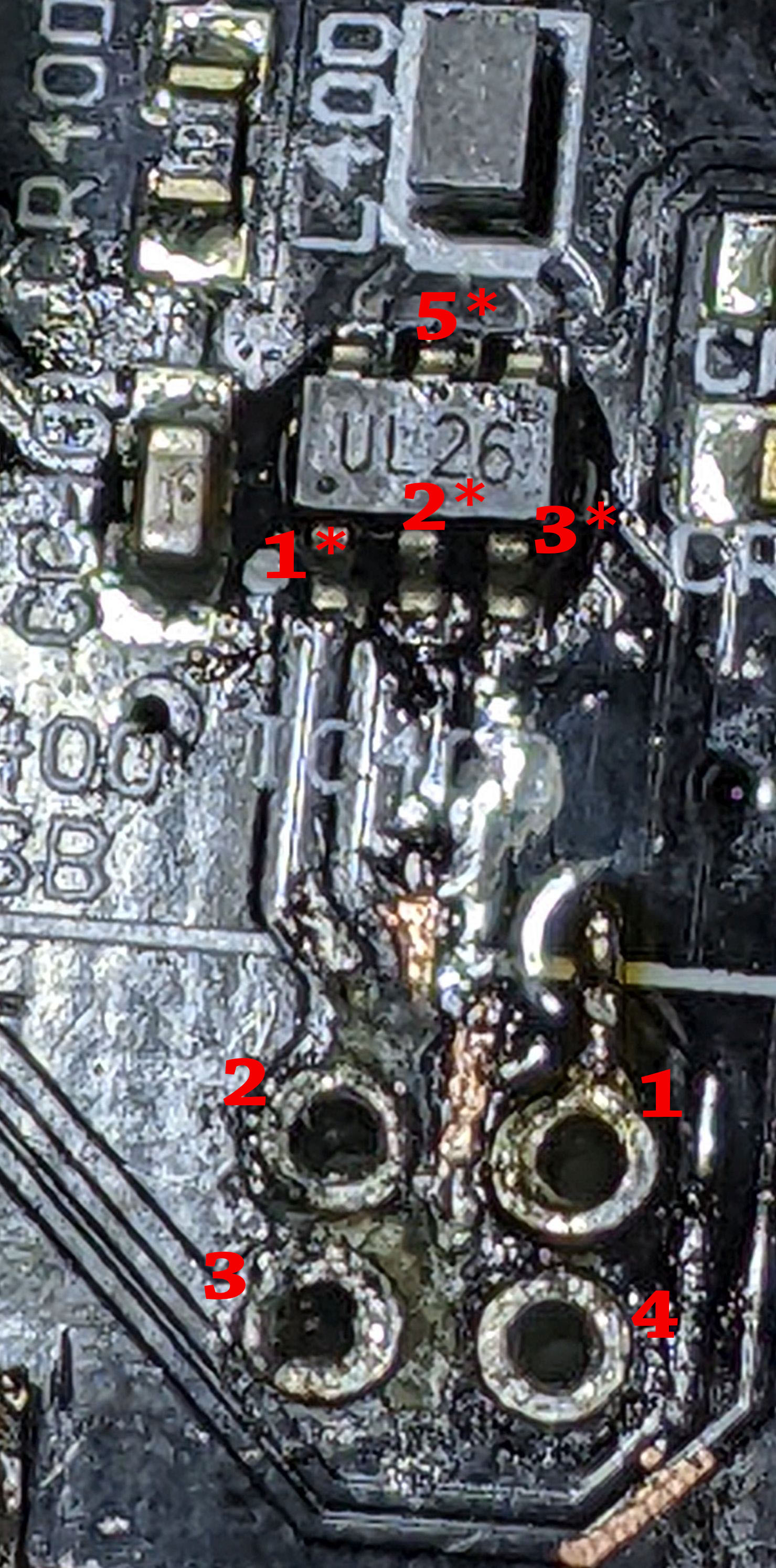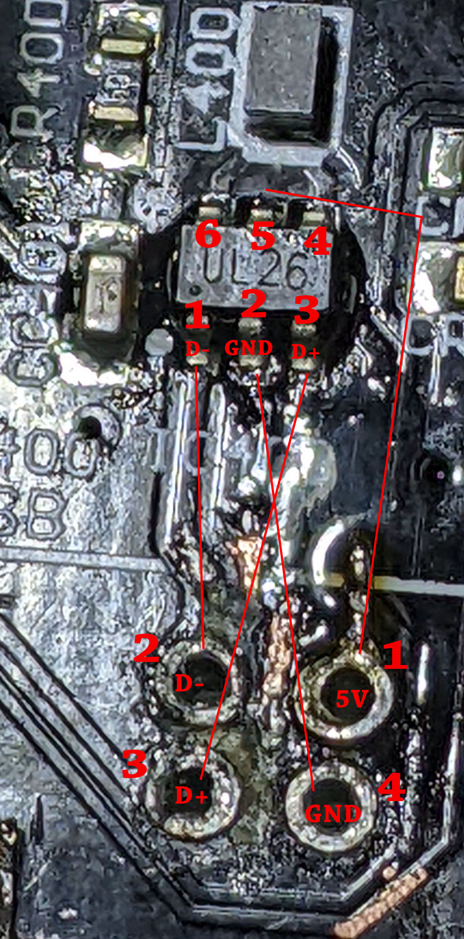 Fixing a usb b port that was damaged and some of the traces were pulled off. Trying to sort out where to run jump wires. There's an USBLC6-2SC6 ESD directly behind the port, datasheet here.