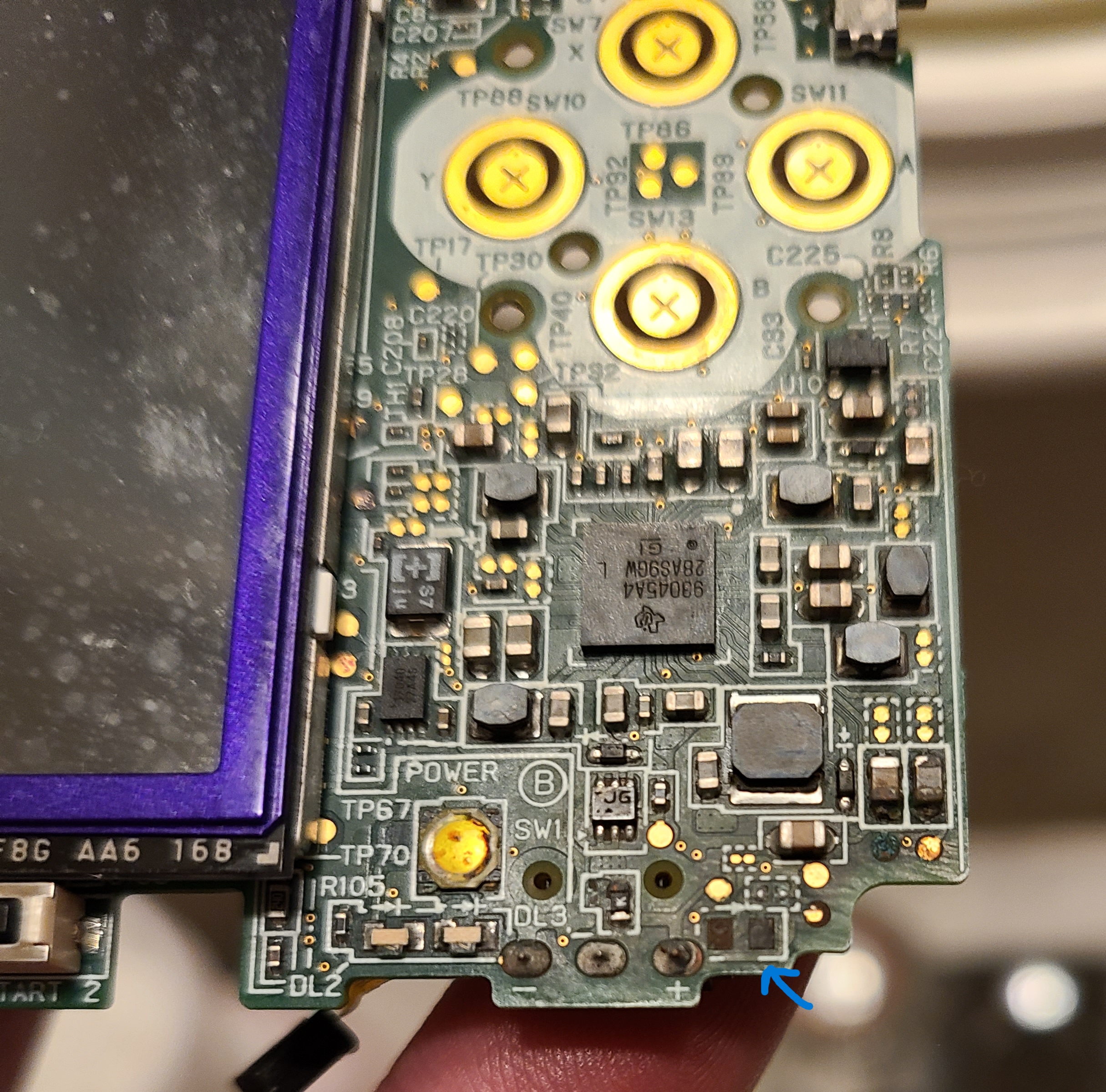 Another day another broken console. I'm working on an otherwise immaculate looking purple 3DS, 2011 version. Symptoms when purchased included sticky buttons and an inability to charge the battery. I opened it up and was unsurprised to find a sticky brown liquid that I am choosing to believe was coke all along the right side of device going down to the motherboard. A bunch of rubbing alcohol and many tiny screws later I stripped the bottom half of the device and removed the motherboard from the case. I noticed in the bottom right that a diode was missing. I assume it was a diode because of the symbol on the motherboard. By total luck I found the missing piece (I think) and as it turns out, it's a surface mount amber LED. I tested the small piece with my multimeter, saw the LED light up and measured 1.82V. In the picture below you can see the area in question for this post. In addition I'm attaching a picture of the motherboard from iFixit's website so you can see what I'm talking about. One problem I foresee is the pads...or rather the lack of pads. No idea it they just ripped off or they're just hiding or something.