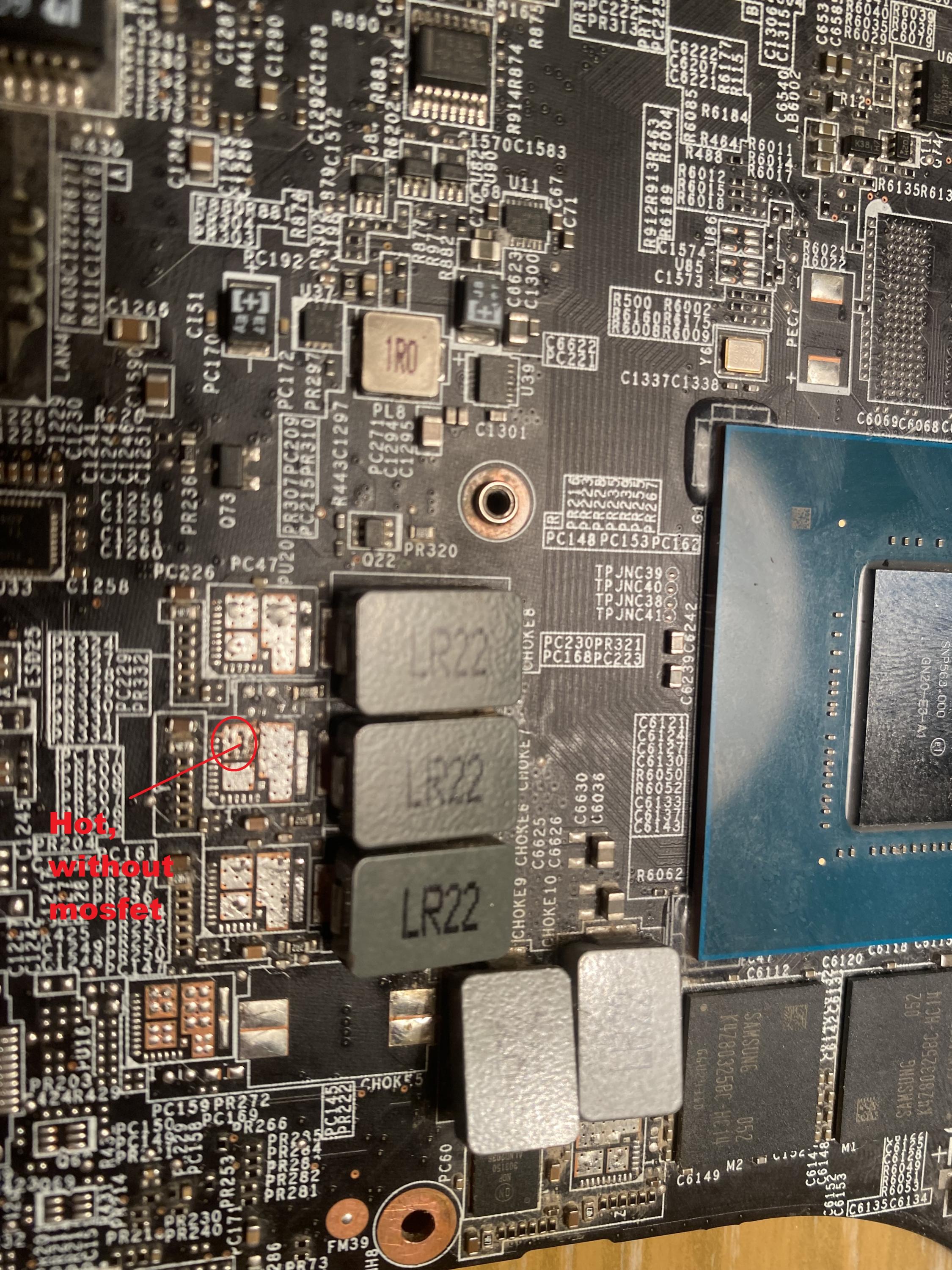 After diagnosing with thermal camera, Q9F1 MOSFET (NTTFS4C50N) is getting hot. When I remove this MOSFET, the short on the 12V rail disappears.