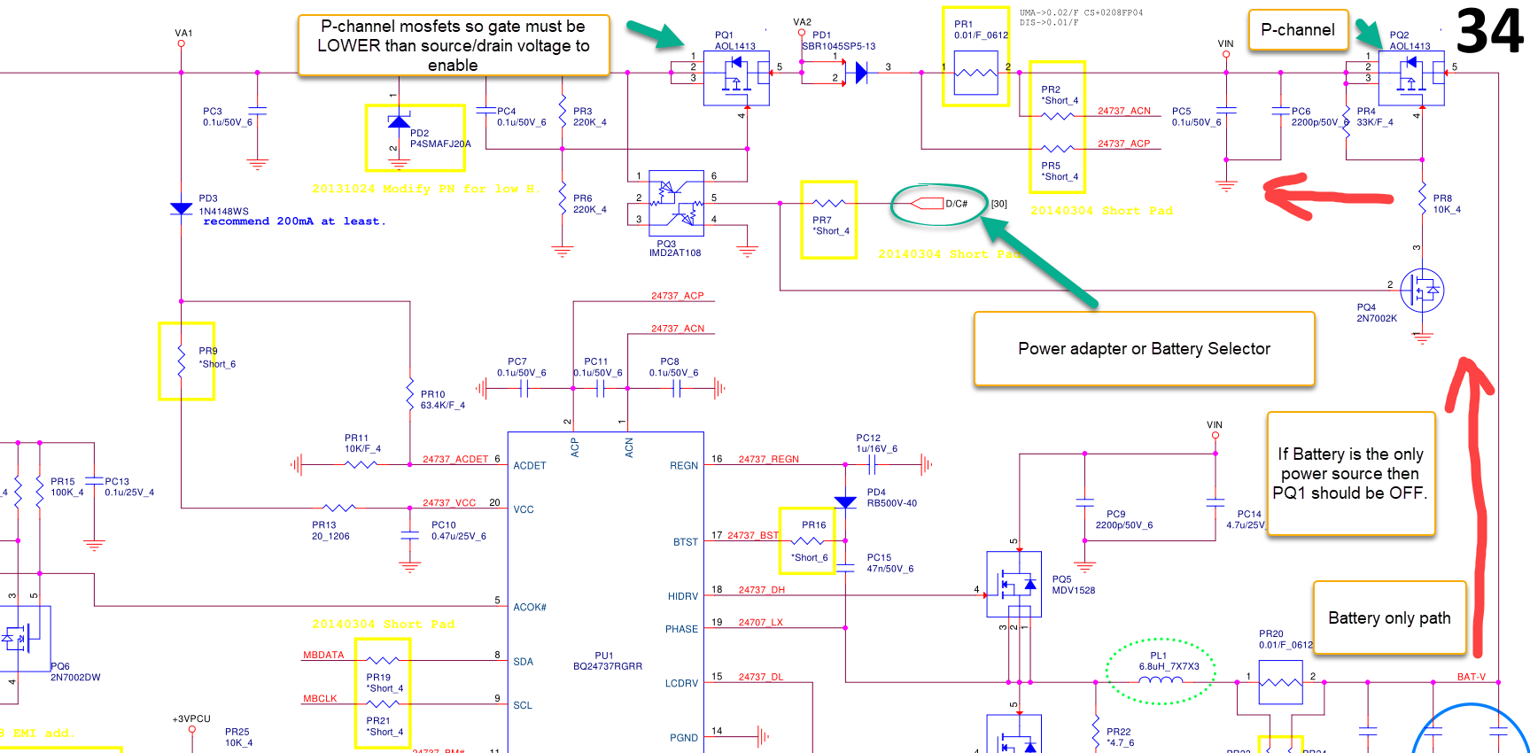 1) The KBC / EC device monitors the power adapter presence by the ACOK# signal. If the ACOK# = LOW = adapter voltage is OK. This turns the dual MOSFETS @ PQ6 OFF.