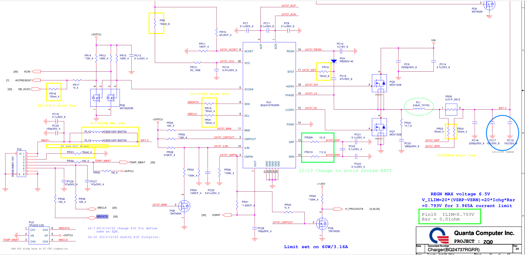 I have this acer V3-472 laptop with board id DA0ZQ0MB6E0 REV:E , With battery charging problem, At first I thought it was a bad battery so, I bought new battery but the problem still the same,cannot turn on with battery only and when battery and charger plugged in no orange light indicator but the laptop is working properly with charger only plugged in. here is the measurement.I noticed when battery and charger both plugged in the voltage on current sense resistor PR1 is fluctuating form 19v go down but when charger only plugged in its working fine here is the measurement of PU1 BQ737 when battery and charger both plugged in.