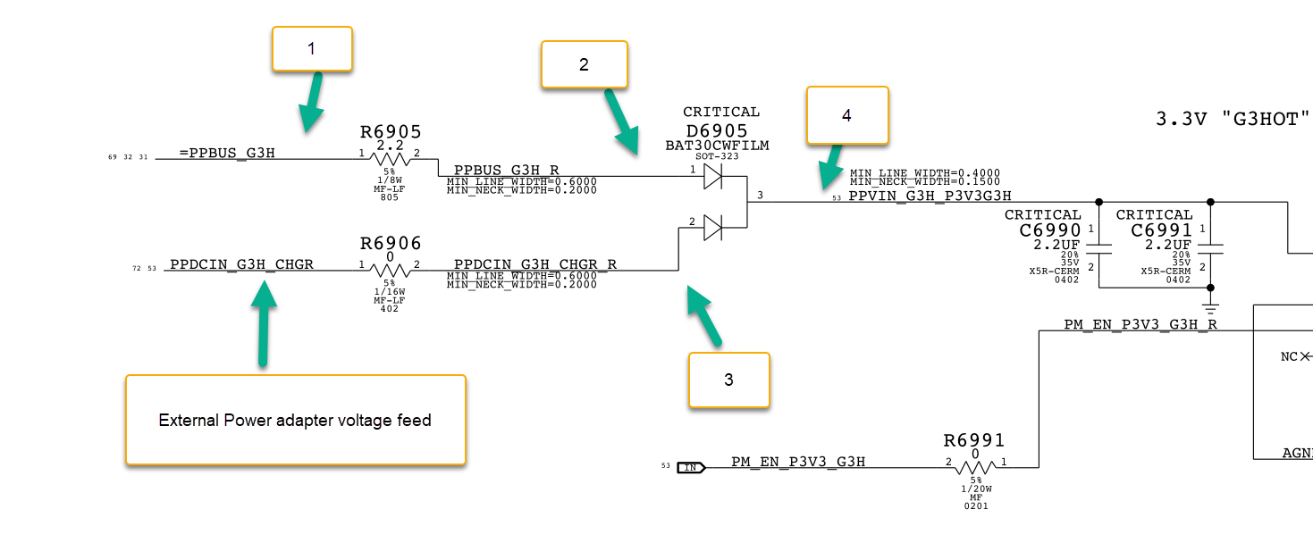 This diode is used to select the higher of the 2 power rails. Since the external adapter is removed, only the PPBUS_G3H side should be active. Need to confirm the voltage to ground of each leg.