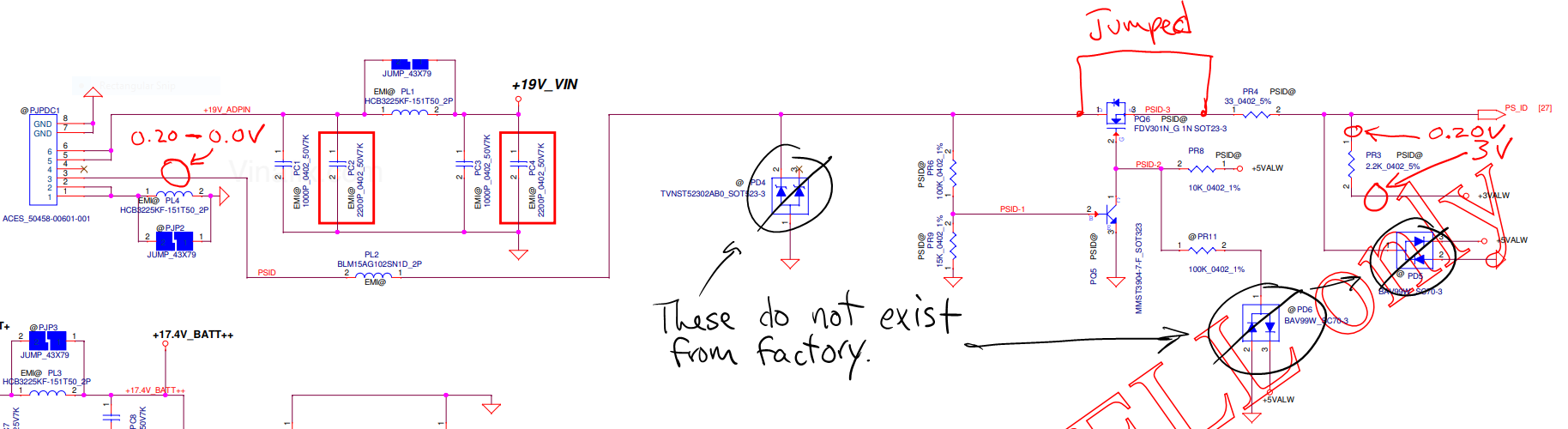 Probably a damaged EC (assuming that's where the PS-ID goes). PD4 is supposed to short out when the DC jack collapses and you get 19V directly up the PS-ID pin. If that's not fitted, then you rely on PQ5 to turn off PQ6 to protect the EC from overvoltage. But that's likely not quick enough so that's the function of PD4.