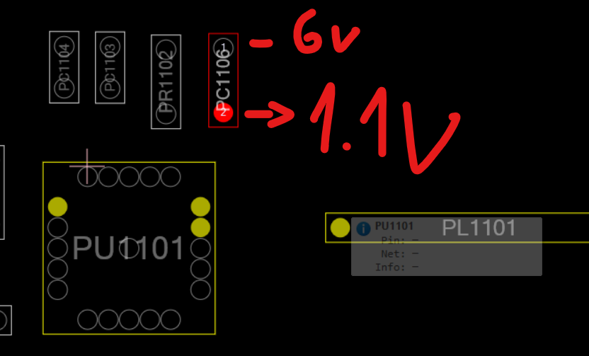 The resistor on the left side of the cap (PR1102) is missing, but I am measuring 6V on both of the solder points.