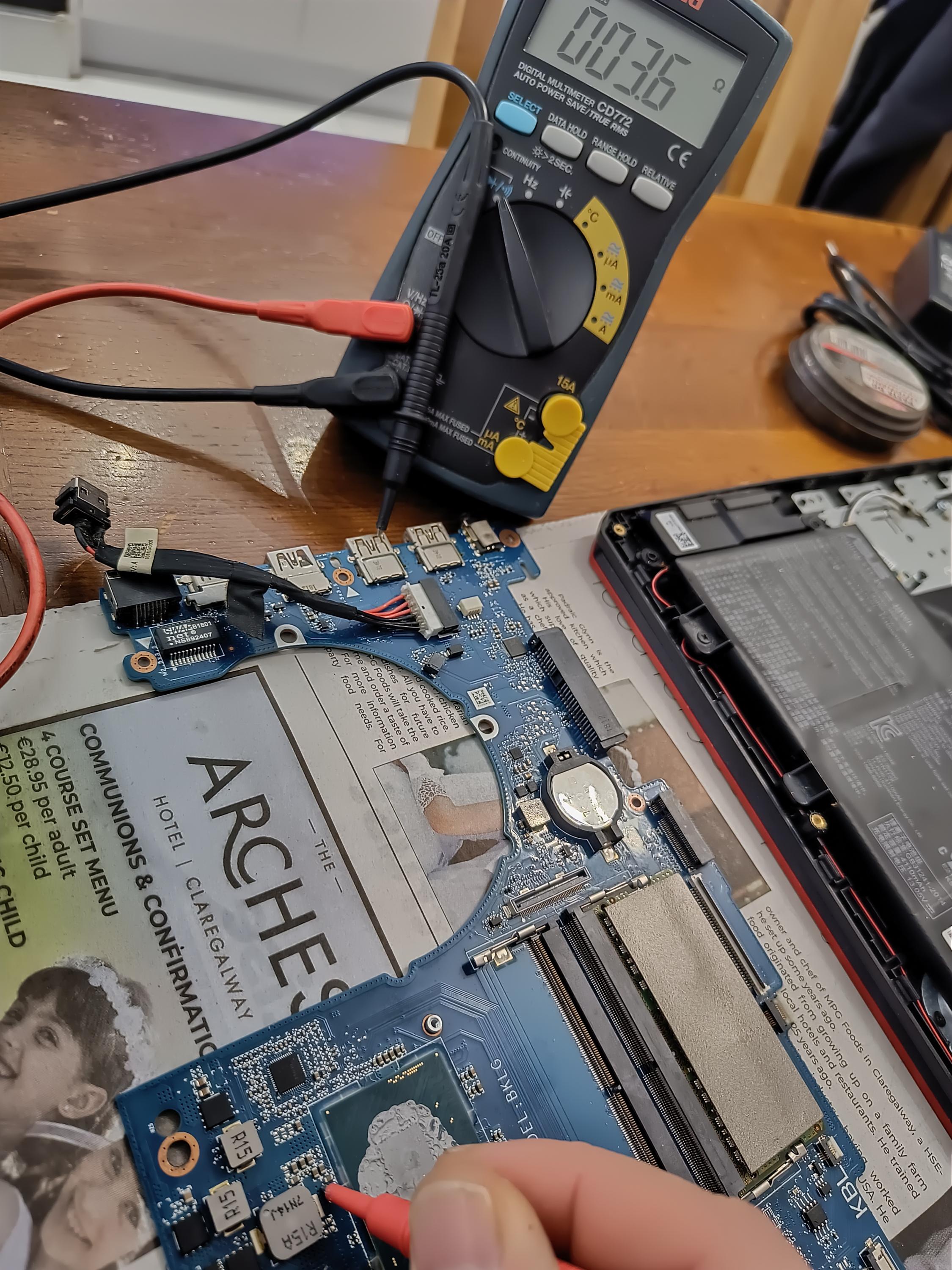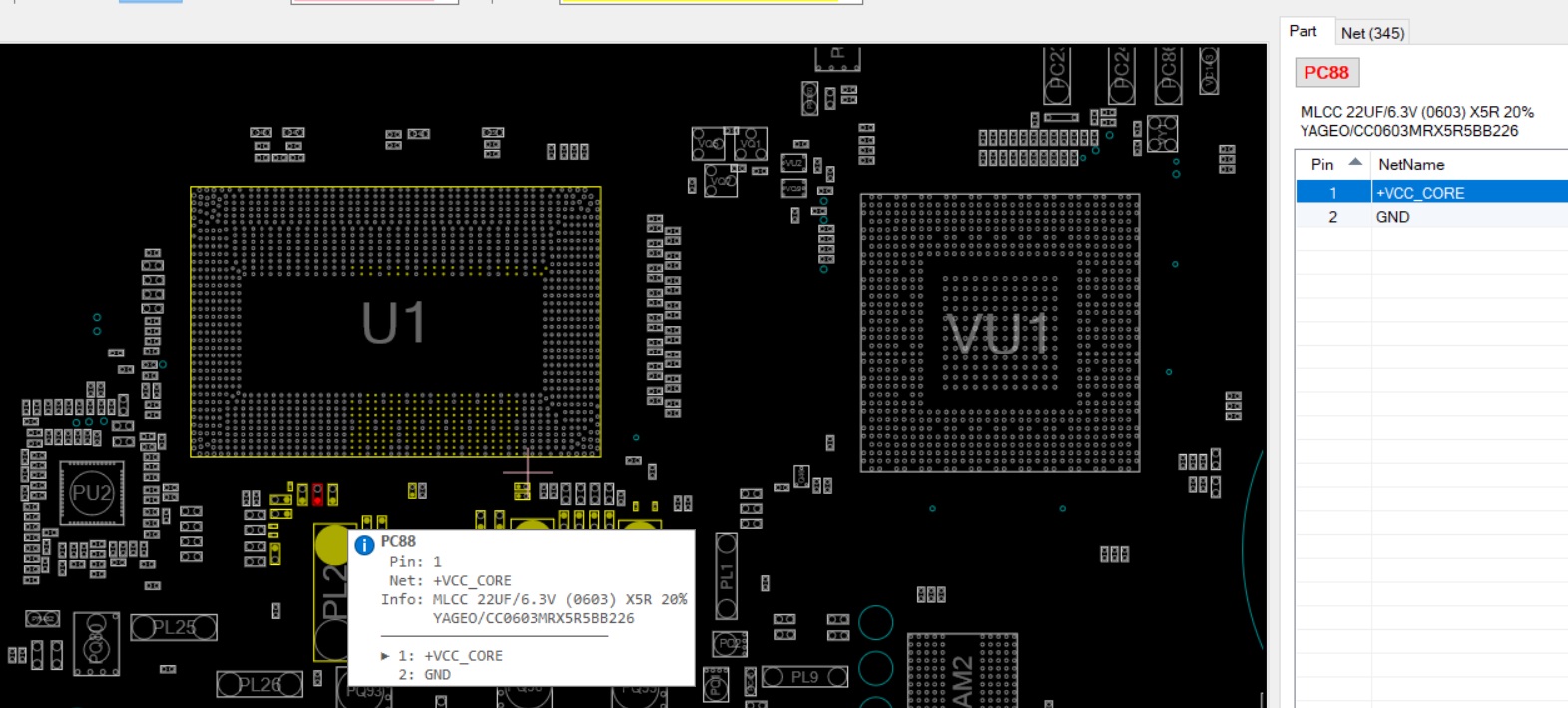 Looking for help with DABKLGB8D0 REV.D board, laptop was in standby mode with closed lid when all fans start spinning for max speed, when I open the lid screen was black closed it again nothing happens fan still max speed, power supply disconnected and all fans stops. After that no live in laptop no led's or any reaction for power button / charger battery etc. I did some checks looks like 19v is exist, check for short to ground: located on rail +VCC CORE all shorts to ground as per photo, also next to it rail +VCCSA is all highlited short to ground on both sides of the board. Thanks in advance for any help.