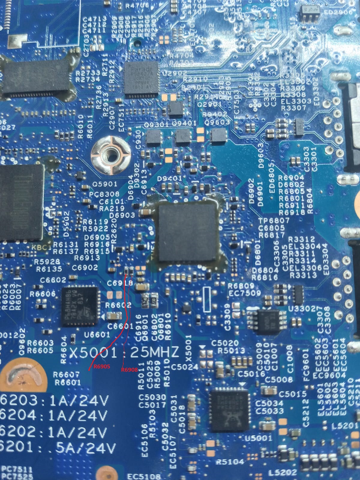 What resistance do you measure for R6905? Remove all power. Measure across the R6905 pads.