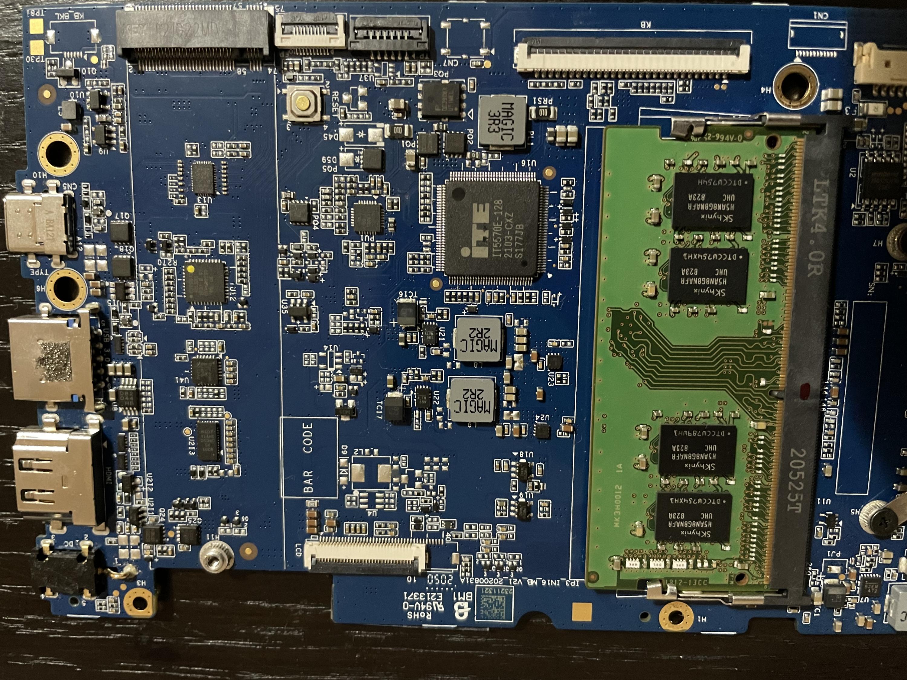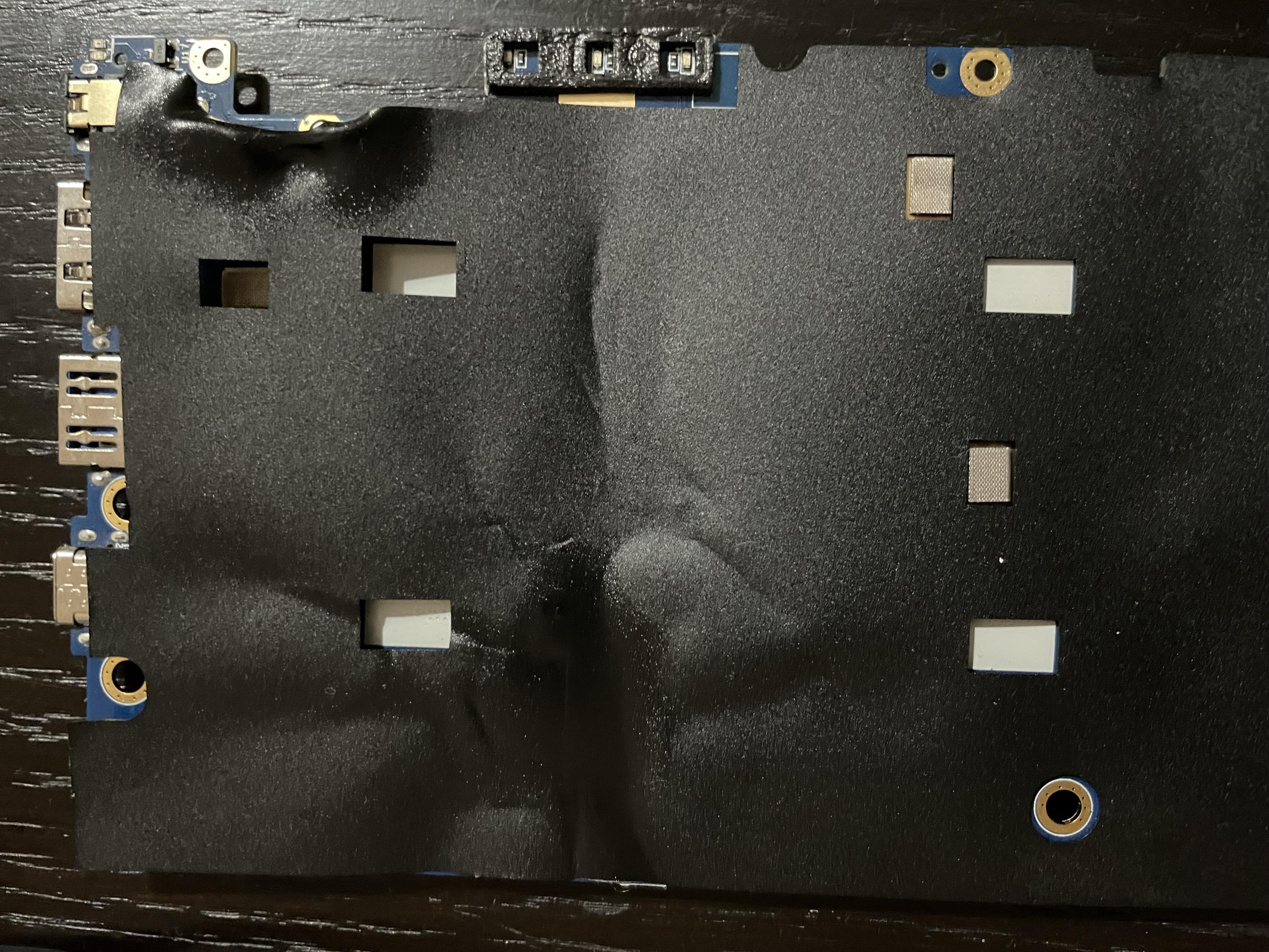 Removing the MB I first noticed the PET film insulator at the back is thermal shrinked seemingly coming from the battery circuit and heavily distorted behind the 2nd DC-in mosfet Q25 (MDV3604).