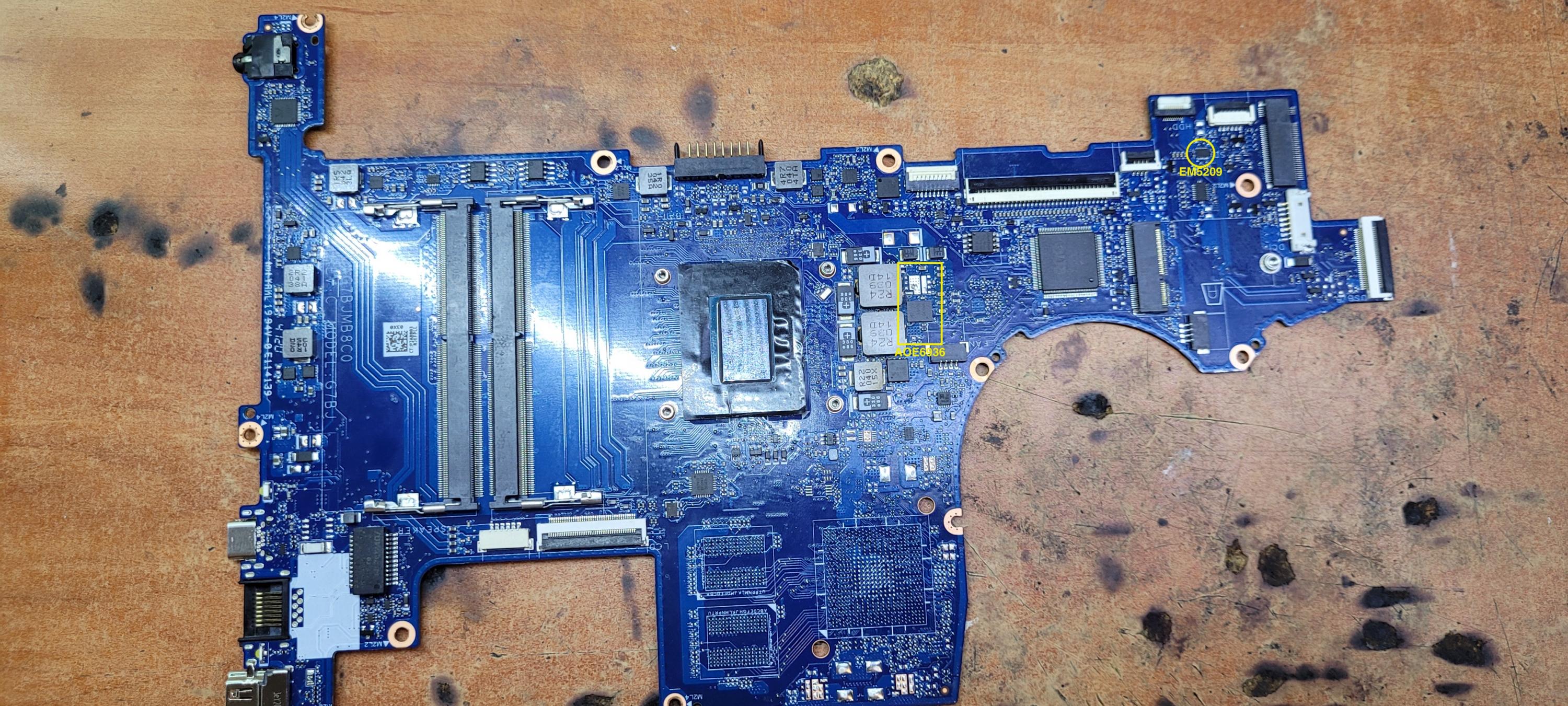 Good morning, I work on a HP motherboard, with a power problem, replace a pair of AOE6936 mosfets that had shorted, a failure of the integrated RT366AC, where the track 28 (VIN) is damaged (attached image) and where I have the doubt of the line that is just above it and making the measurement marks me short, and it is where I can not determine if the fault caused that it reached a GND layer of the card and on that line was the line (VIN) looking at the card more incidents of short on the line (VIN) I found the integrated (EM5209) attached data sheet and where the lines 1 and 2 that carry (VIN) are integrated. , The line 28 of the RT366AC I do not know where it comes and if it is only that the enamel of the card has discovered its existence or I have short on that line but should not have short on all lines VIN) ahH! to replace the mosfets and make the bridge of the IC RT366AC (28) to the capacitor, turned on the team, without video signal, but returned to make the short the mosfet's AO6936 and that is why the doubt. I found diagrams similar to the model, but do not correspond to any integrated of this model.  thank you