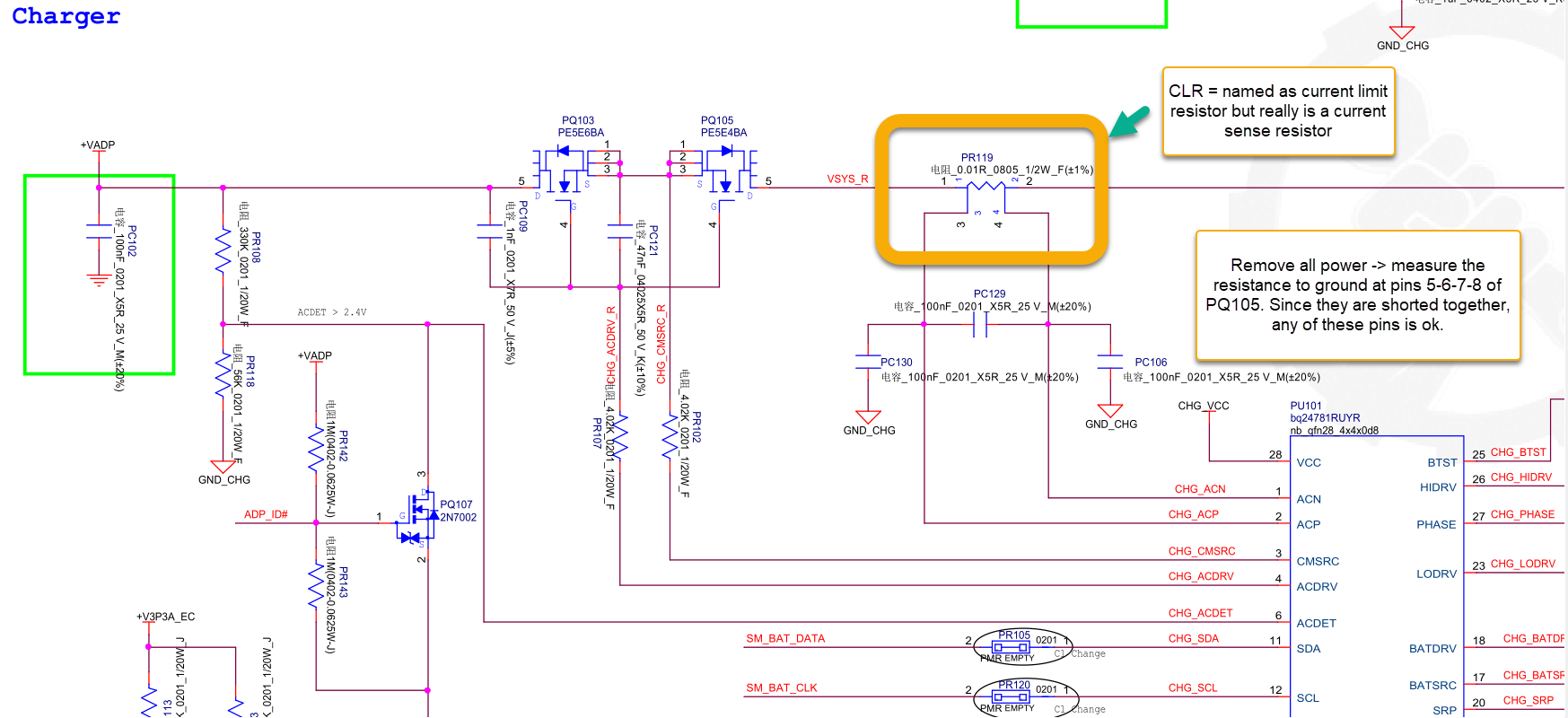2) Next, check if ACDRV voltage to ground (without PR107) is being boosted or not. (Carefully) check at PCB pad that is mated with pin # 4 (ACDRV) on the charger IC.