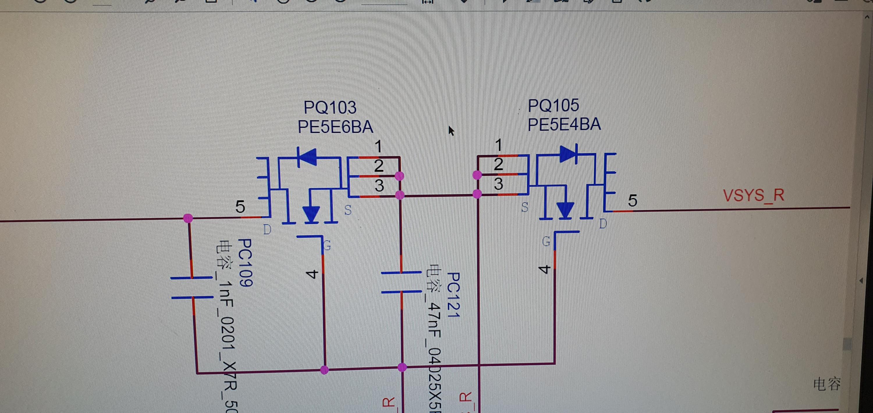 PQ103 and PQ105 are N-channel mosfets. This means that the GATE voltage pin # 4 must be HIGHER than the voltage being passed between source / drain pins to enable. Otherwise, these mosfets will remain OFF, unless they are leaking.