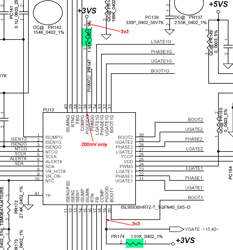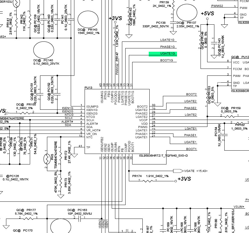 +CPU_CORE is present on both phases. I found 15 Ohms on UGATE1G on controler that drive highside fet (on other board this pin is in kohms)