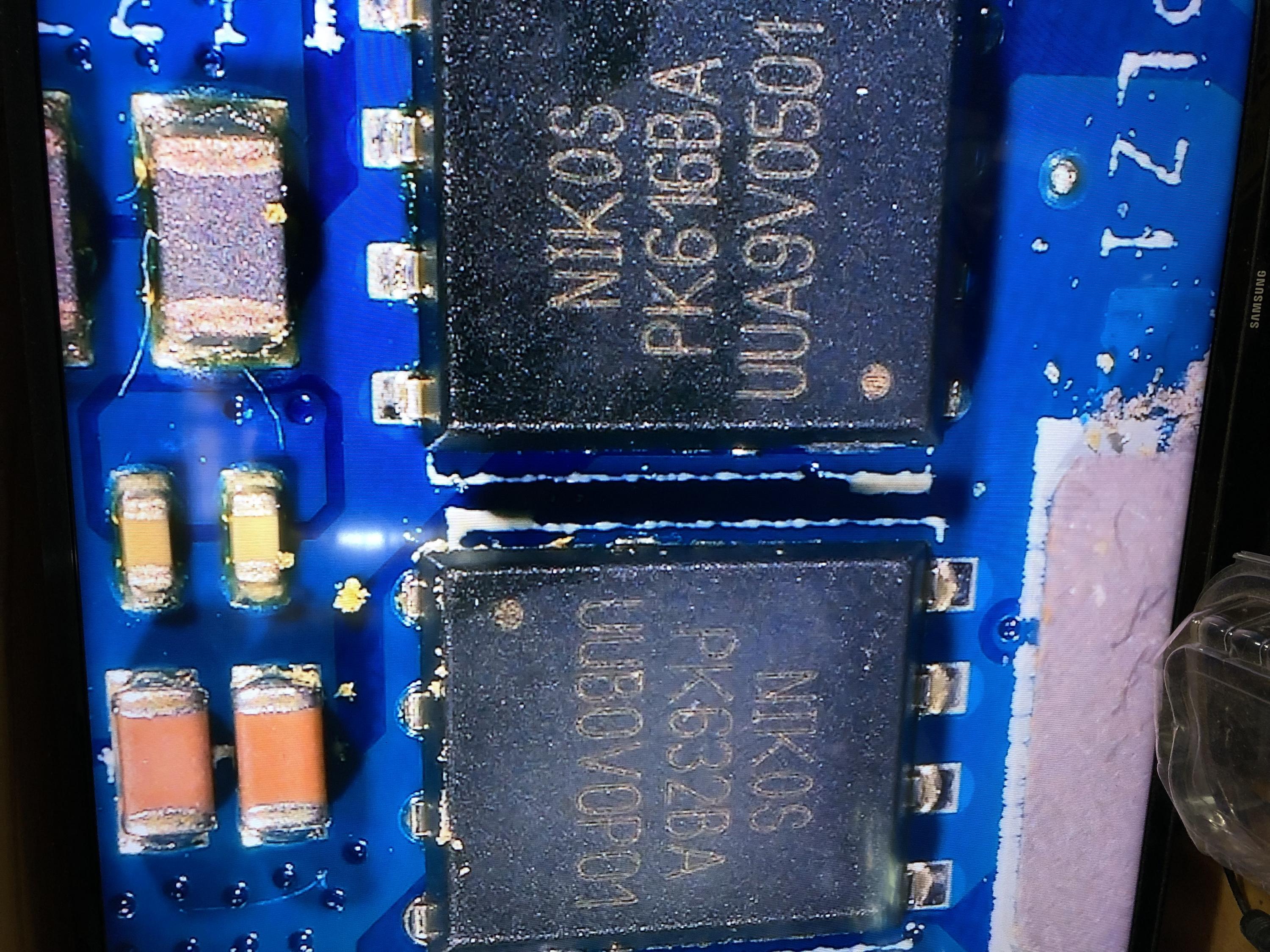 Hi guys have an issue with a friends labtop that has no signs of liquid damage.They said it just stopped turning on.When i press the power button it turns on normally like 35-500millamp draw and it posts and i have picture. But like after 4 seconds after it posts an image it shuts off completely.If i press power button again same thing happens. Did all basic troubleshooting with the motherboard like fresh thermal paste with it completely out the chasis with battery disconnected. Thermal camera shows these two mosfets heating up more than anything else when i press the power button.I have provided a picture of the mosfet location on the board which are heating up I assume to be the Mosfets for the CPU.Which measure 30 ohms resistance on the coil. And I also have 2x new replacement mosfets that i think are the same. Possiblly you all can kindly confirm that these two mosfets are the same?