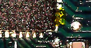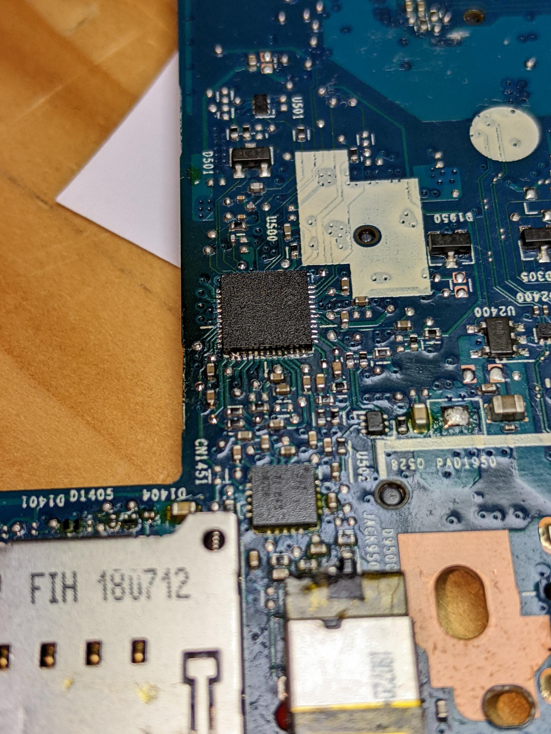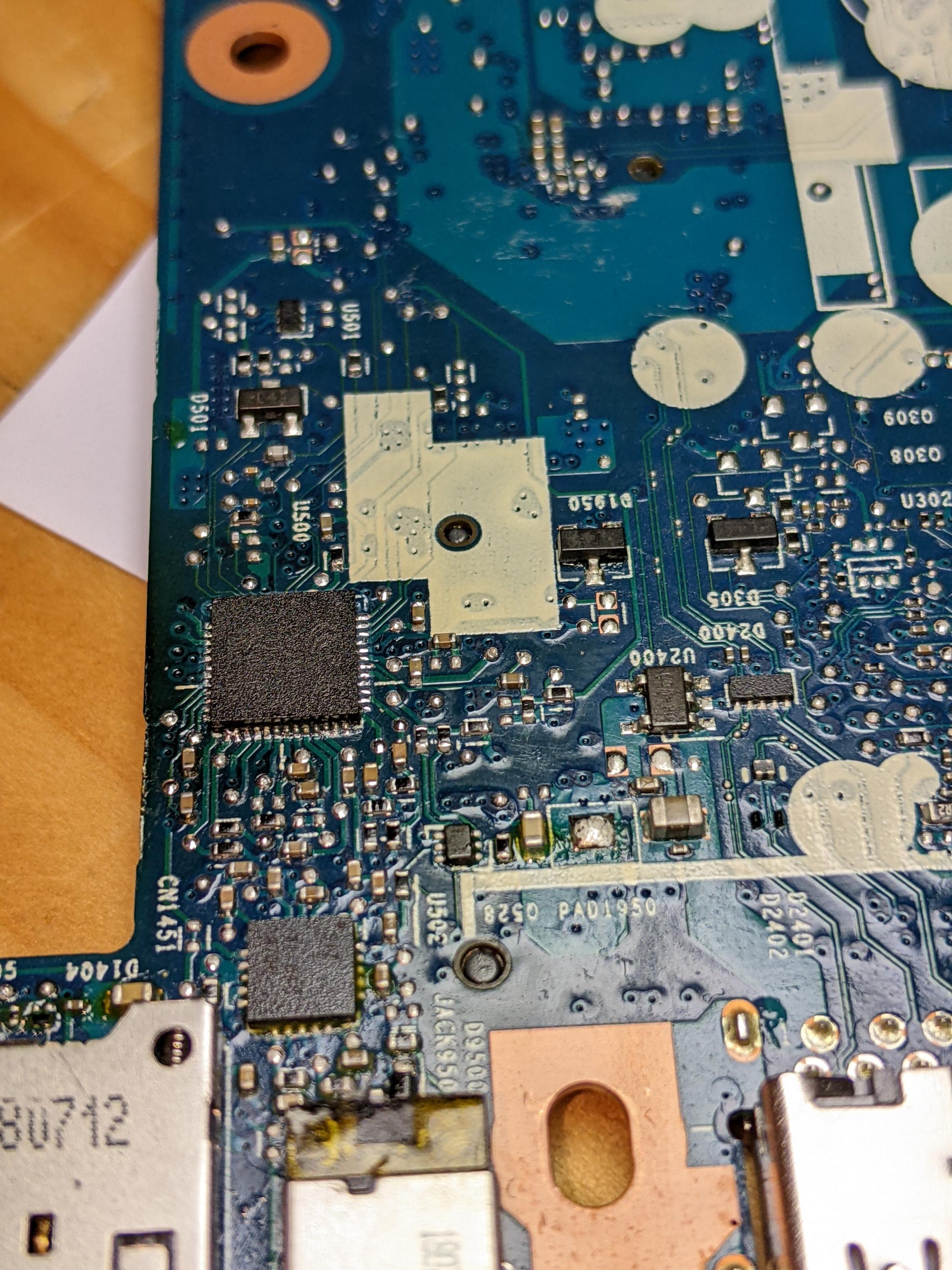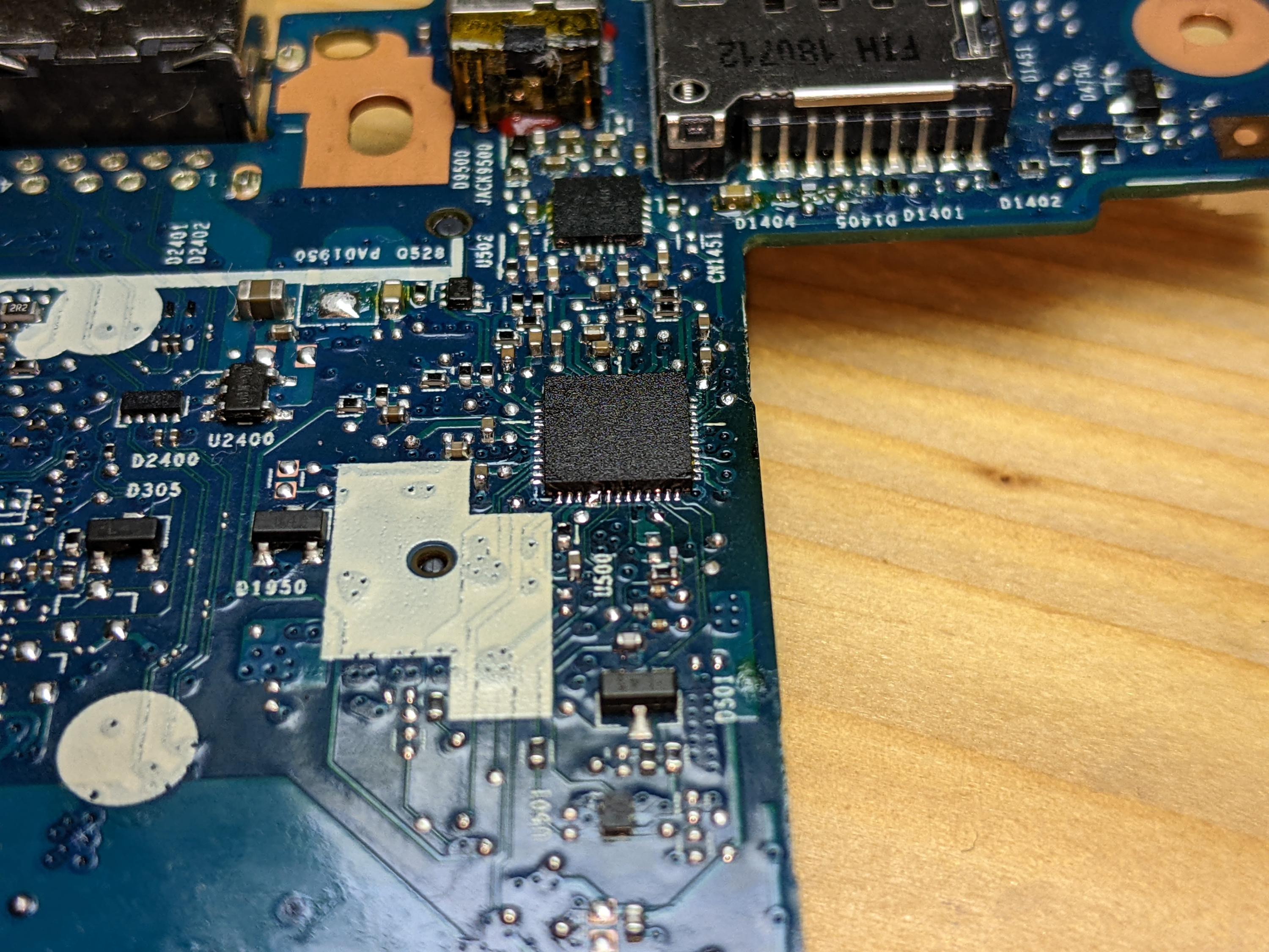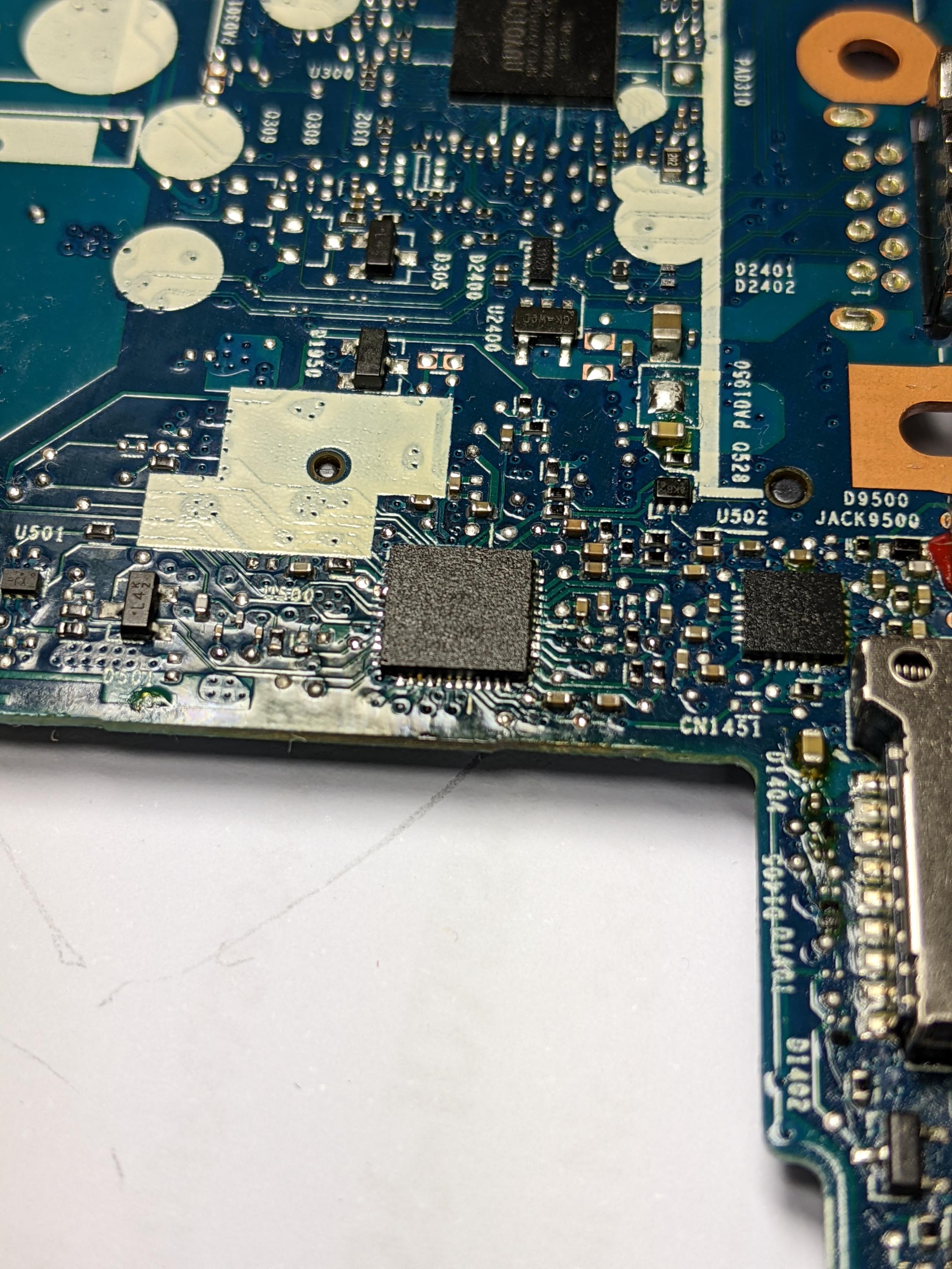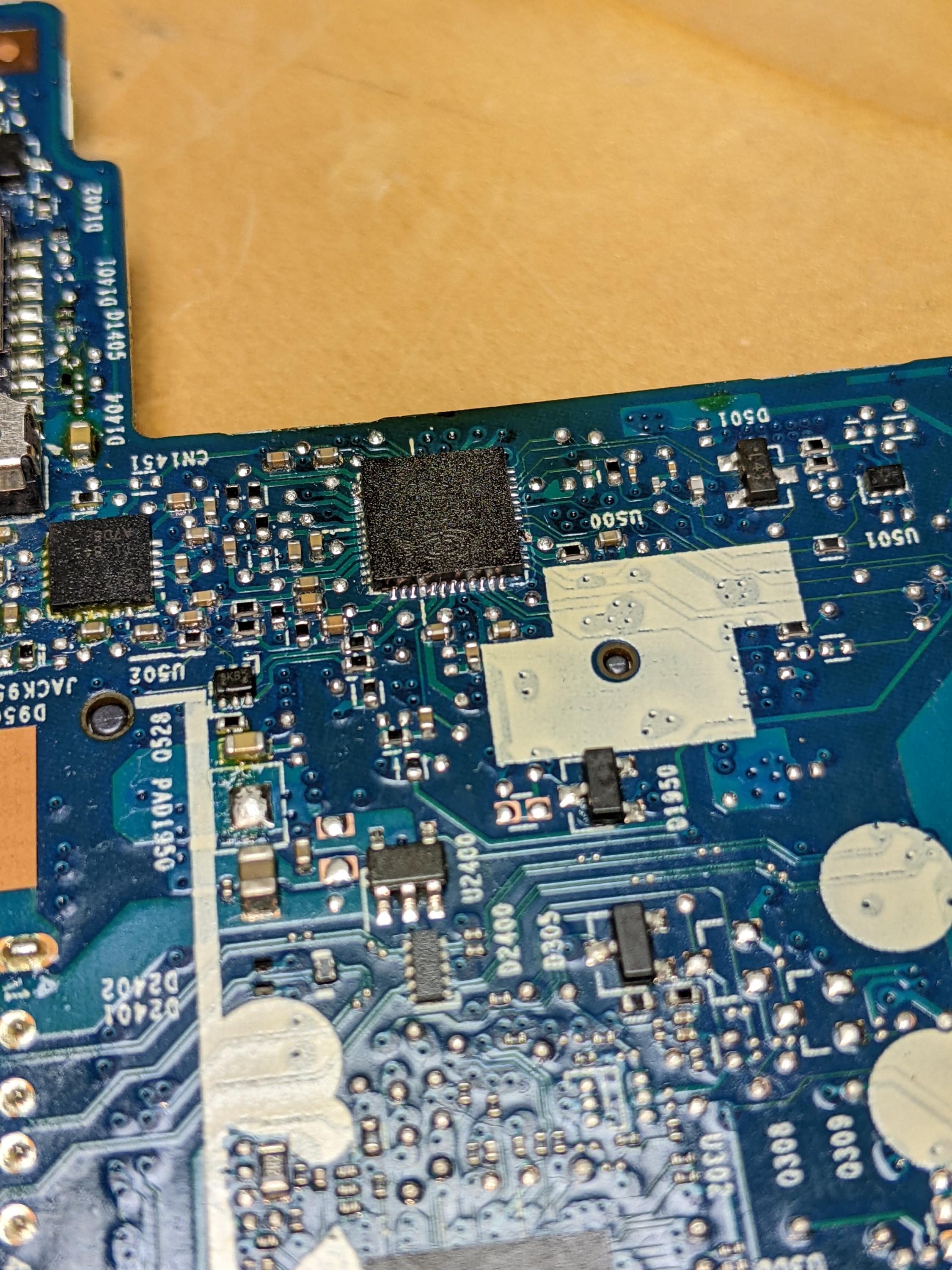 The screw fell right onto the battery connector area and unforunately managed to short one of the supply voltage lines of the Audio IC (Conexanct CX 7750) without me noticing at first.