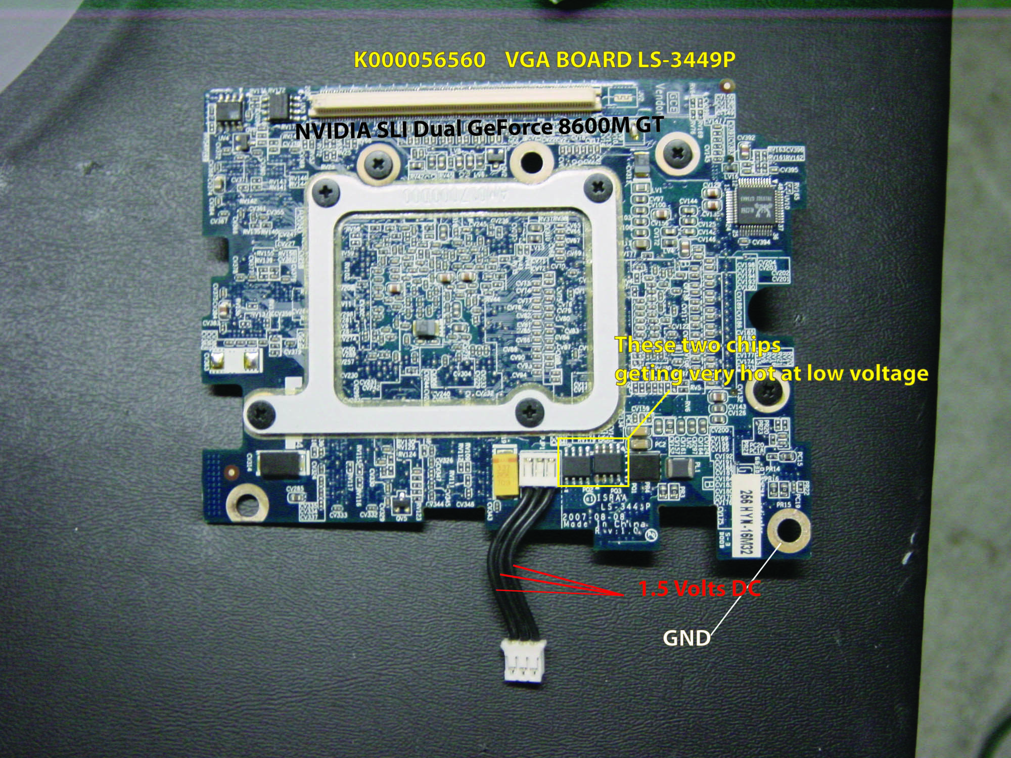 I've have an NVIDIA SLI Dual GeForce 8600M GT that has short on the board, when it's plugged into the notebook (satellite x205-sli1) it takes the psu right down no power light, battery not charging nothing at all, remove the card & the notebook attempts to boot and will fully charge the battery. I measured the video card voltage output on the motherboard (without the card installed) and it measured 19-volts dc on all three pins.