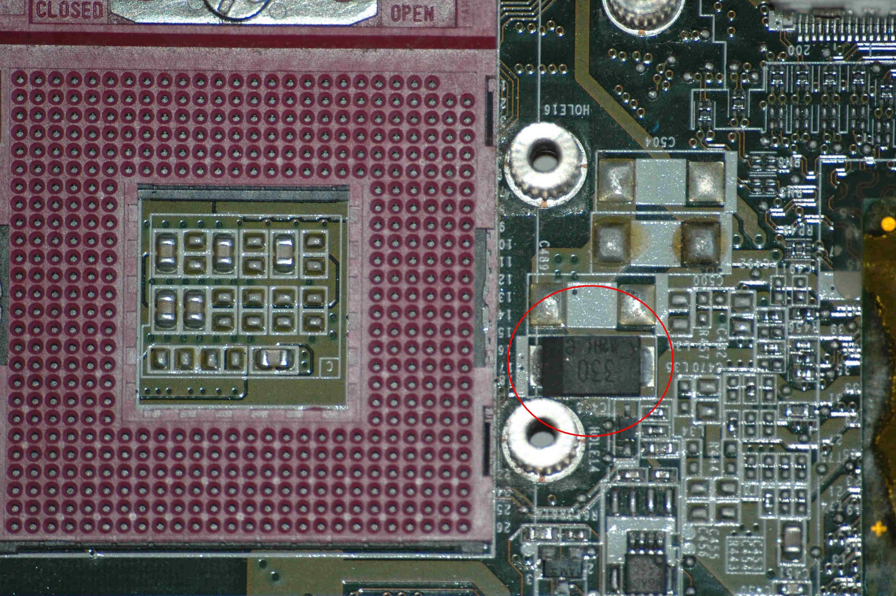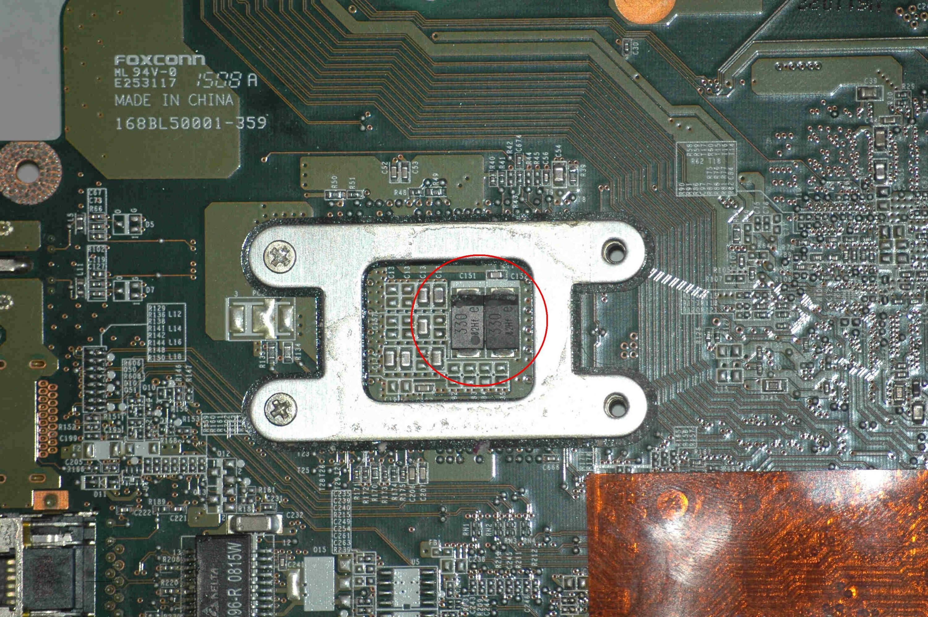 As you can see in the pictures I've attached here, there are five capacitors 330uF/2.5V (identified with letter from "A" to "E") involved in CPU power circuit control. I think to replace them with new one.