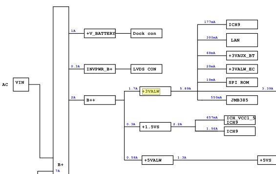 I can´t find the schematic either, but all laptops have a regulator circuit that feeds +5VALW and +3VALW like in the follow screen capture.