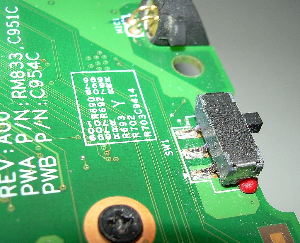 Switch is non working as the red glue Dell used has come loose and the soldering on pin one has cracked.