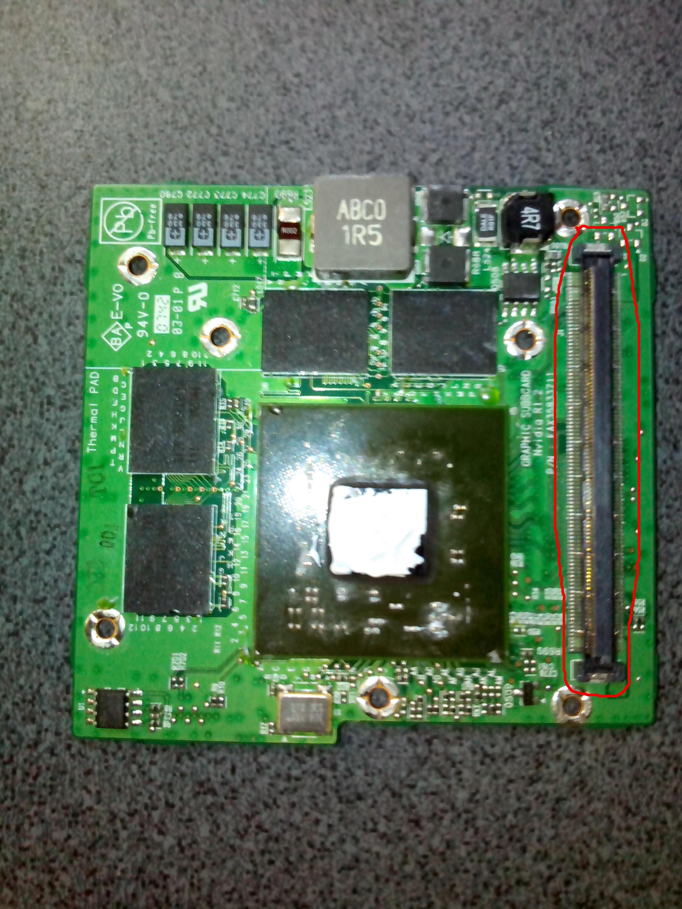 Hi, I have this graphics card from an LG R500. It is the usual suspect nvidia 8600M and works after a reflow. The interface with the MB is unusual and I am having trouble finding a replacement because of this. Would someone tell me the name of the interface - circled in red. Anybody know what other cards are compatible with this interface?