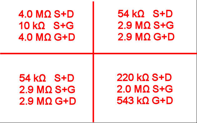 ok, for all 4 of those grouped mosfet's, the values with the Charging IC removed (D,S,G to GND), are ;