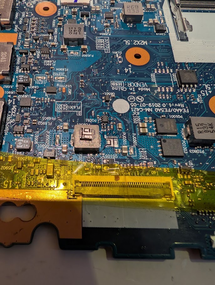 Unfortunately my Lenovo L14 Gen 1 (motherboard NM-C741) was involved in a terrible mishap. At first, one of my friends accidentally spilled coffee on it which made some of the ports stop working but the computer worked fine otherwise. After that I stupidly opended it and forgot to disconnect the battery... One thing leads to another and I accidentally short it between two components (unfortunately I do not remember which components). After that I get nothing, no charging indication, no boot indication, no fan spin, nothing.
