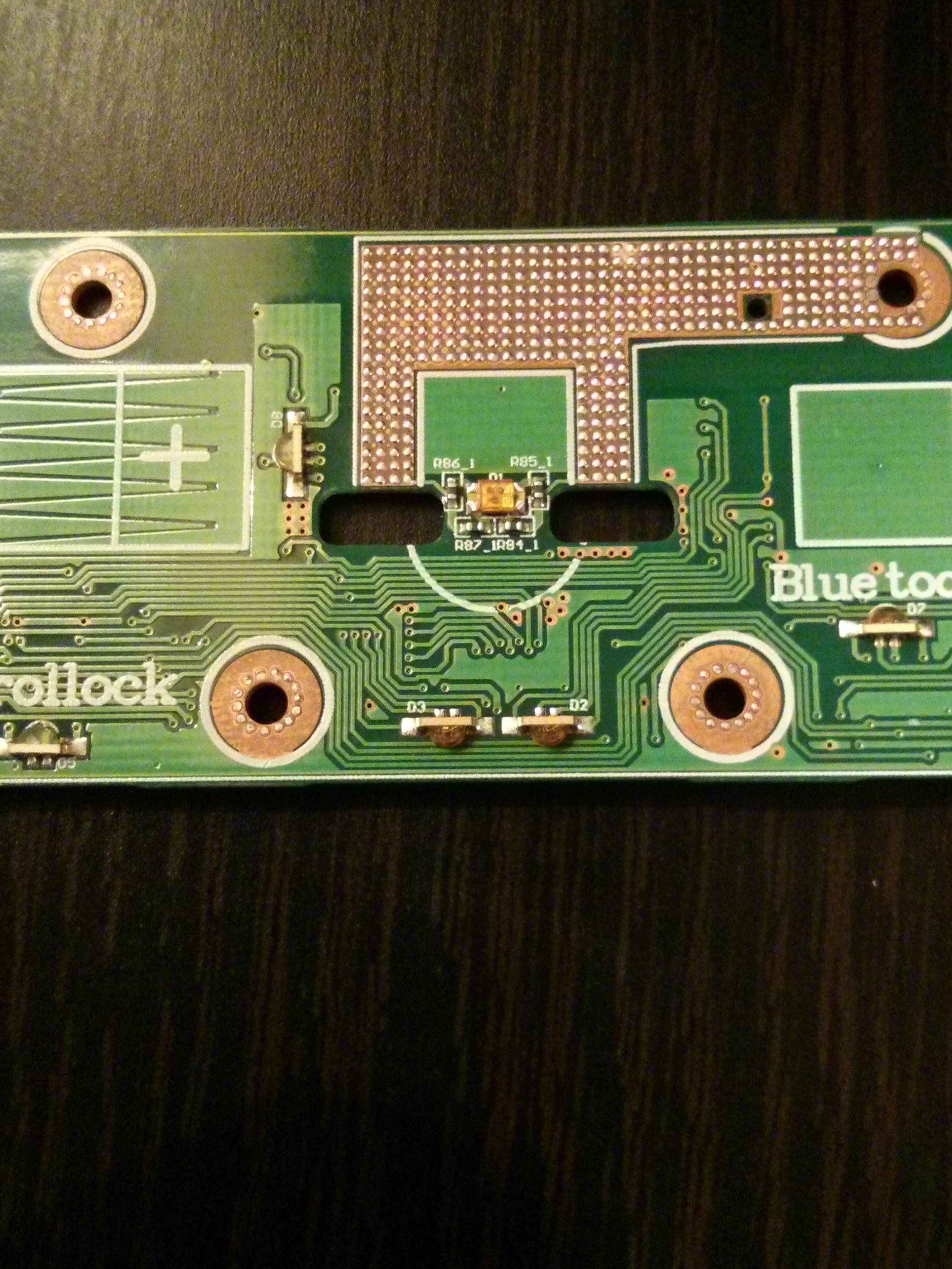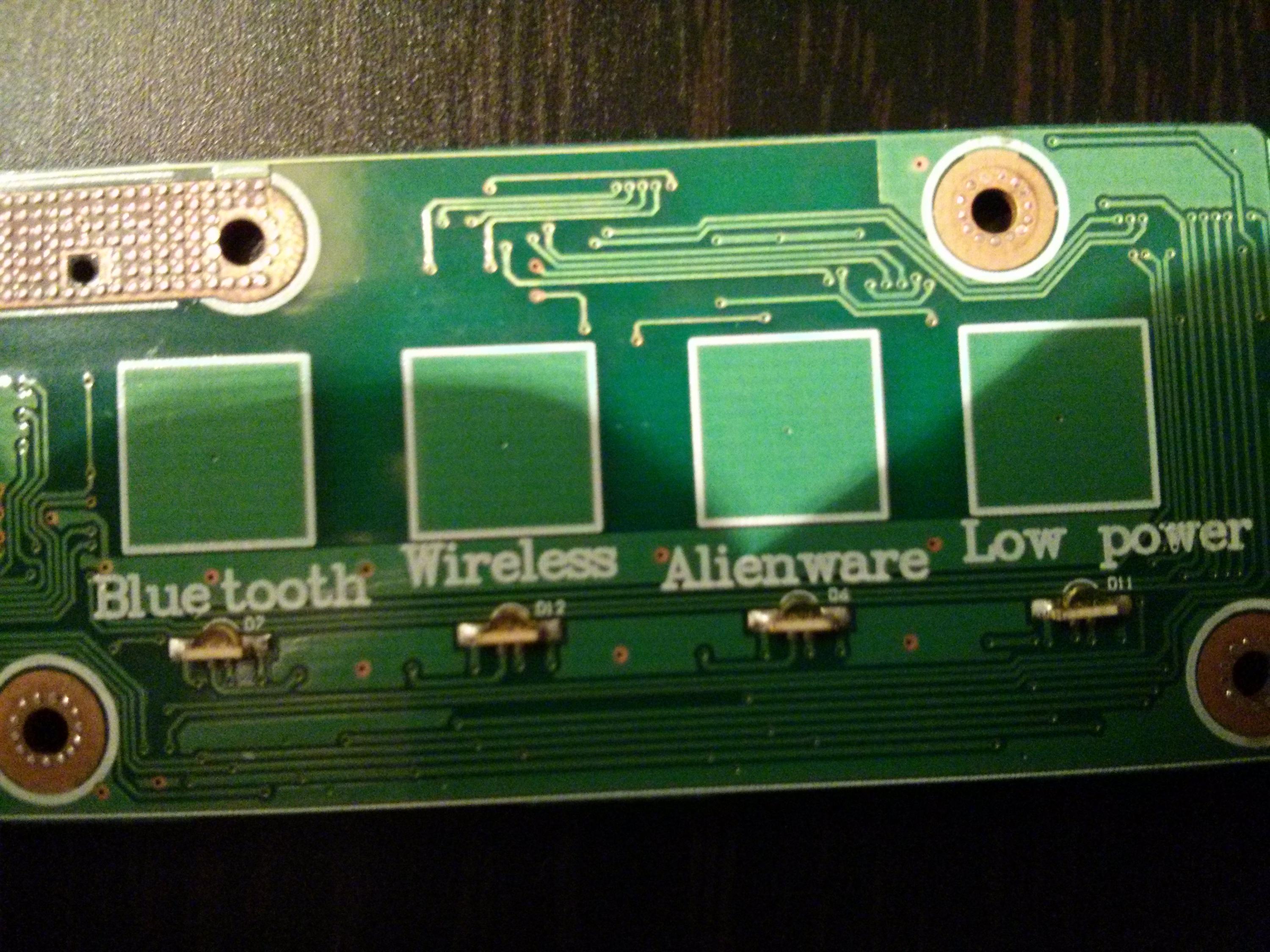 The board underneath the power button that has LEDs for Capslock, Numlock, Scrollock, Power, Bluetooth, Wireless, Alienware and Low Power - none of which are lighting up. I have to admit that since I got it the power button was stiff and had to be pressed fairly hard to switch the machine on. Although I didn't often use the power button as if put the machine to sleep and then wake it with any key.