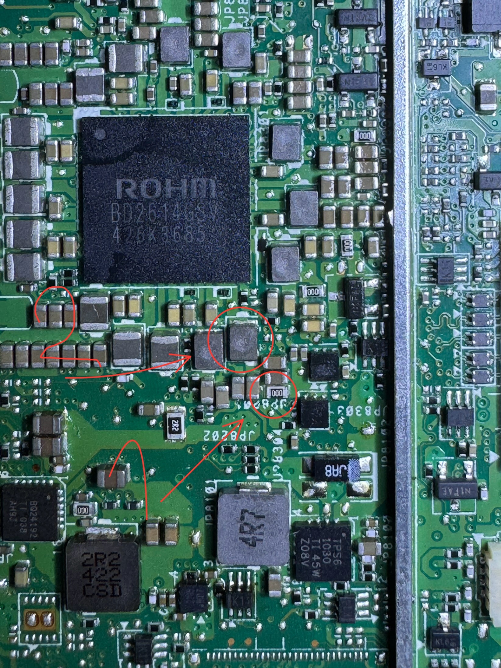 i've also checked with thermal camera and there are 3 components getting hot immediatelly. 0 ohm resistor (1 marked on picture) and component (2 marked on picture) and then the big chip