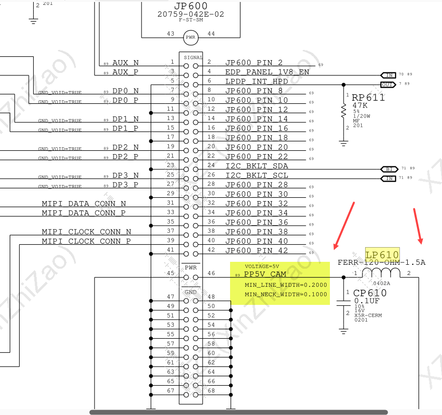 Measure the voltage to ground of PP5V_CAM on each side of LP610.