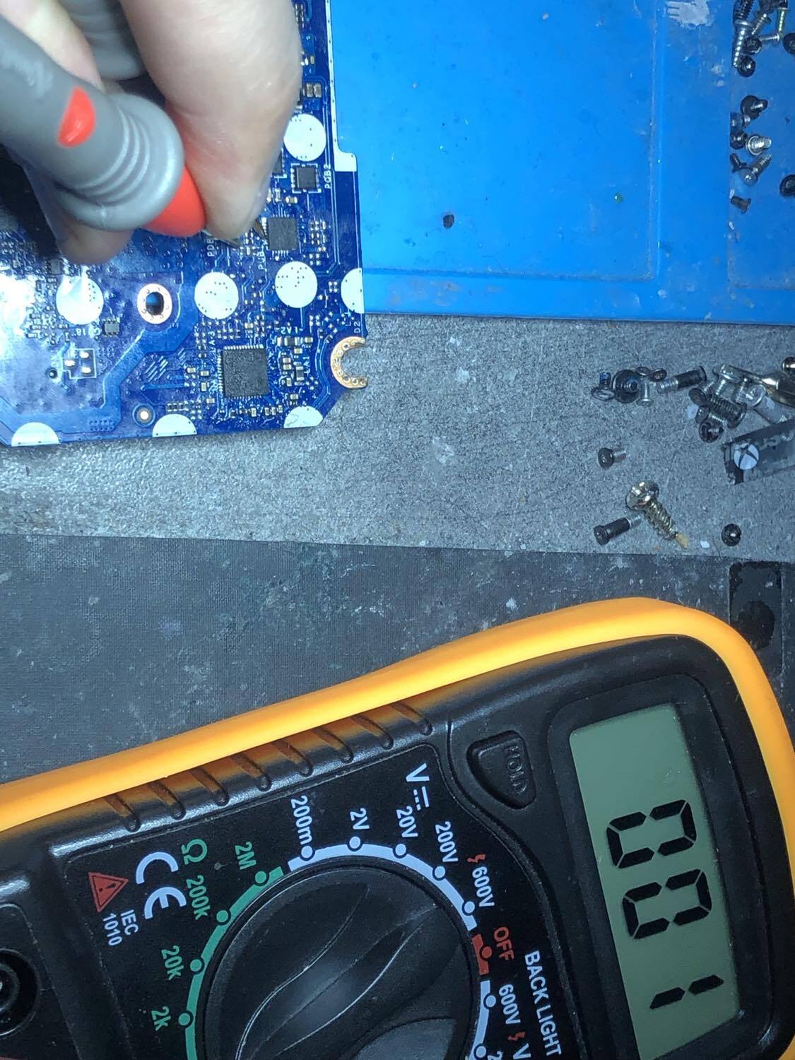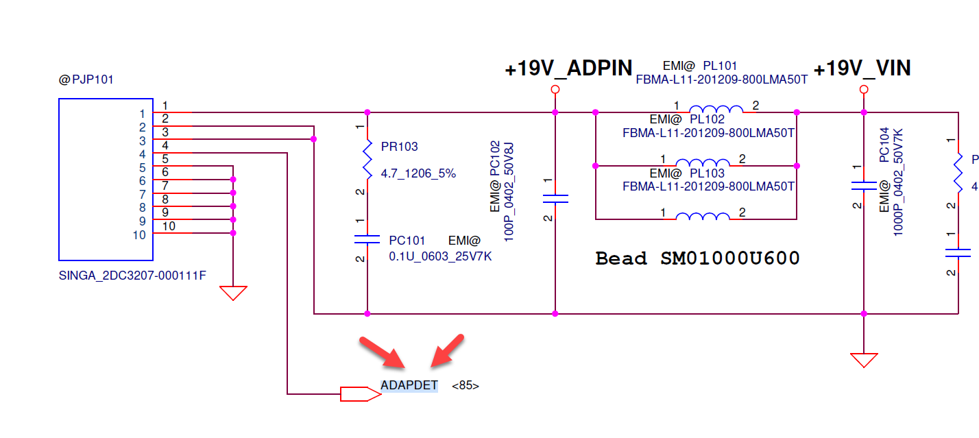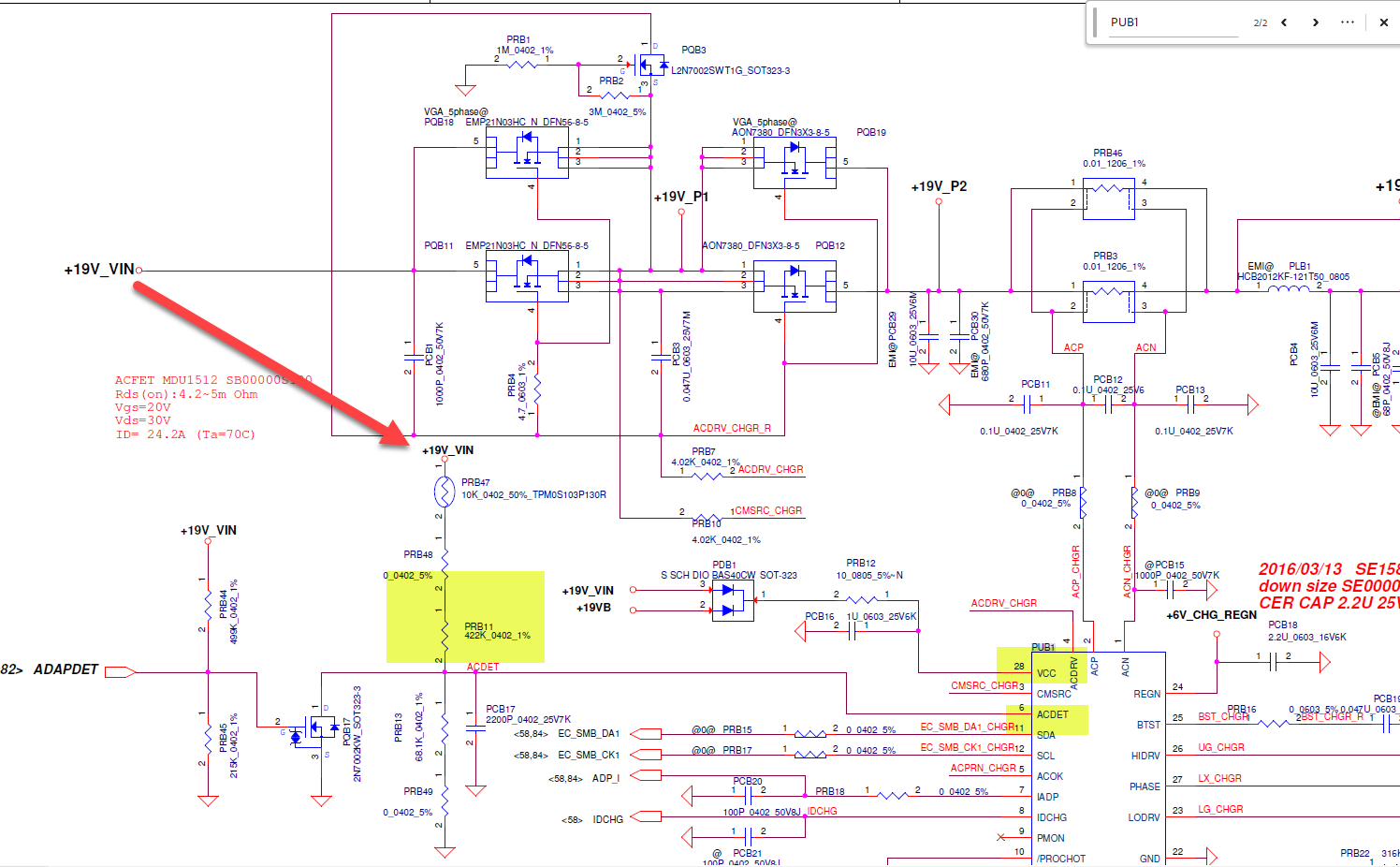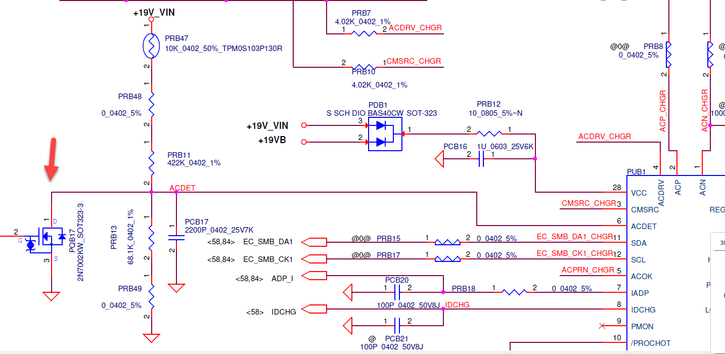 3) Update - confirm the voltage to ground of ADAPDET which is from the power adapter. This voltage should be 0 volts - that is, when the power adapter is mated to this logic board, this ADAPDET line should pull the GATE voltage of PQB17 (2N7002) to be low or 0 volts. This in turn will turn OFF PQB17 so that the ACDET pin on the charger IC can receive a valid threshold voltage from the power adapter. If the ADAPDET line is NOT pulling the gate pin to ground then PQB17 will be ON (due to the voltage divider resistors on the same gate pin) and then ACDET will be pulled to 0 volts. PQB17 is acting like a switch to ground for ACDET. Confirm this area.