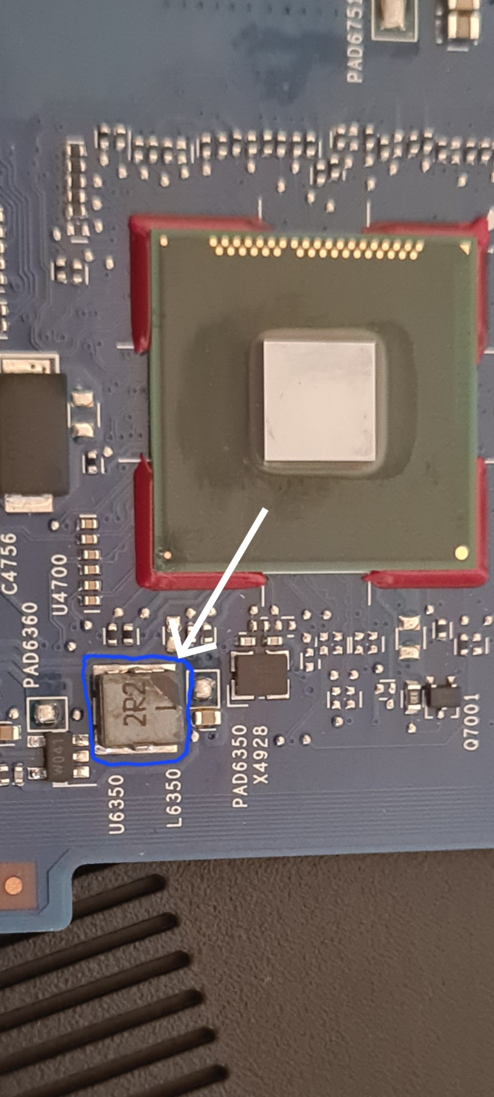 I did a close visual check and find an inductor that looks in a sorry state, next to what I think might be the PCH. I can only see 2R2 I (or L), but from reading, this is not enough to identify the various specs required to get a like requirement.