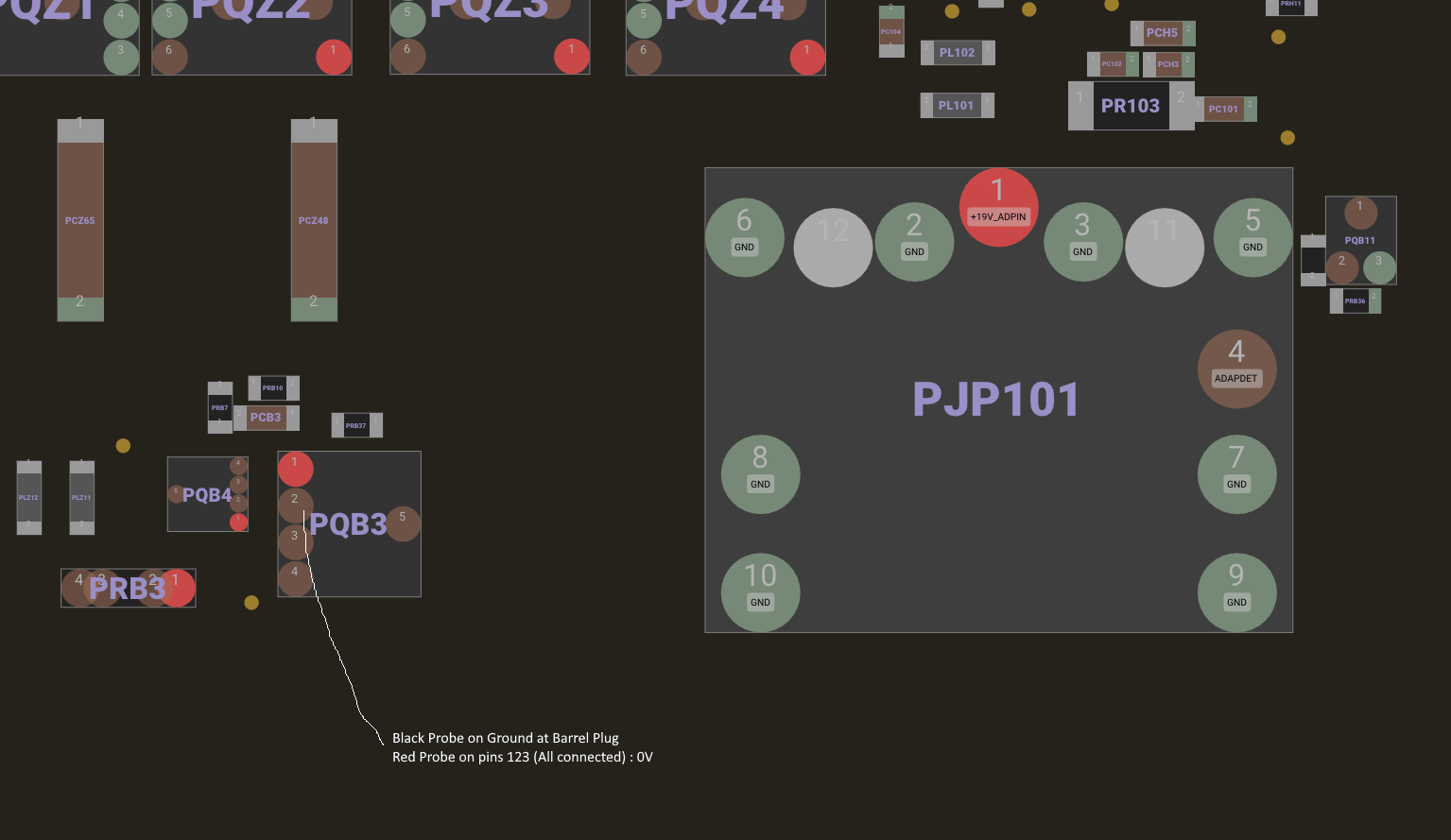 PS: The power adapter is a brand new one that tests fine. The old power adapter wasn't outputting any voltage anymore. Before the old power adapter died, the laptop was working fine. I did a visual inspection and saw no blown components, burn marks, or anything else that I would consider being a problem (water damage signs, or corrosion).