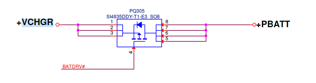 3) Attach the power adapter and battery -> meter in DC volts mode (20v or high scale is ok) -> measure the voltage to ground of each pin on the battery mosfet @ PQ305.