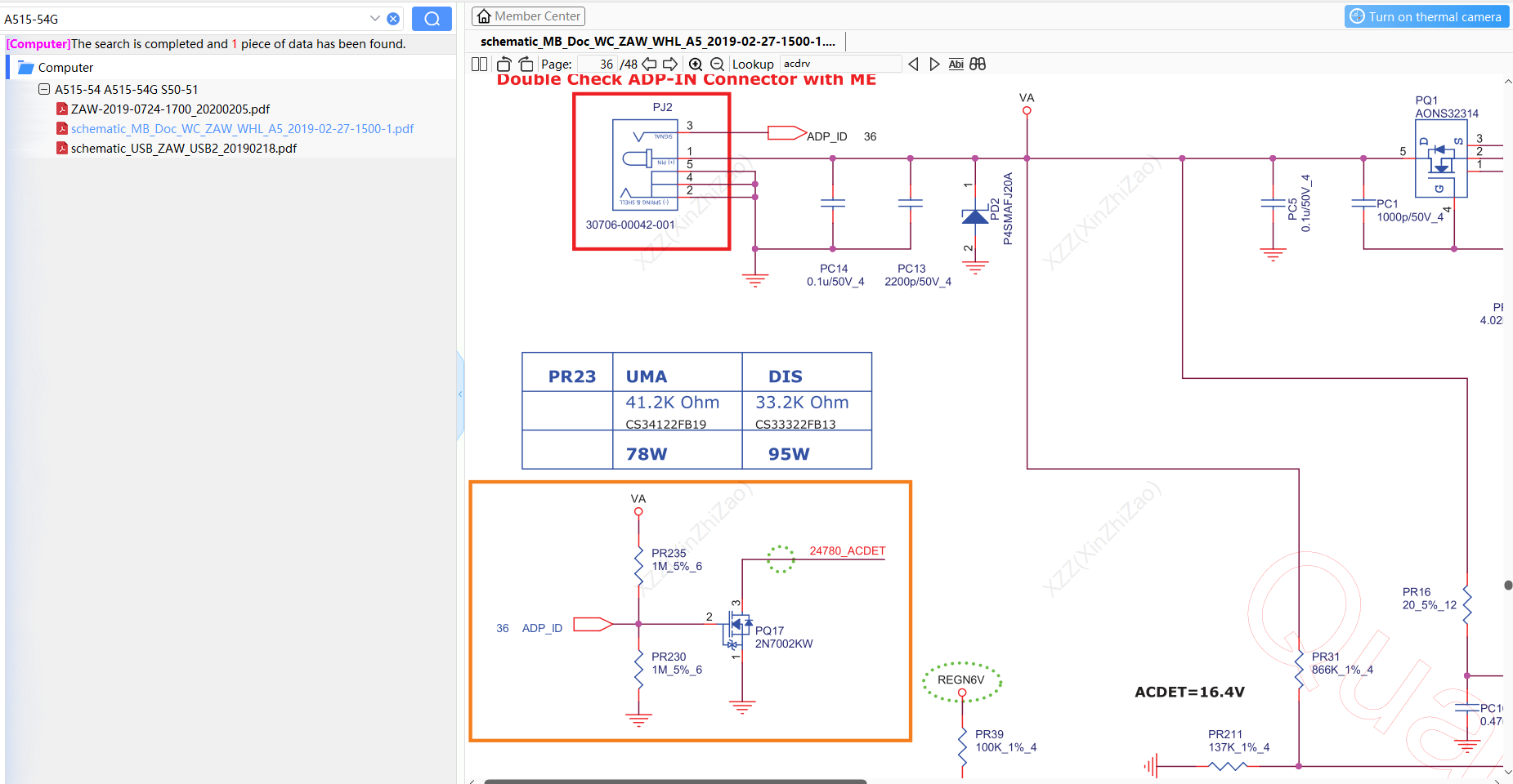 When properly mated with the power adapter, the ADP_ID pin should go low and this action will cause the mosfet @ PQ17 to turn OFF. Only when the mosfet @ PQ17 is OFF, will the proper voltage appear at the ACDET pin on the charger IC.
