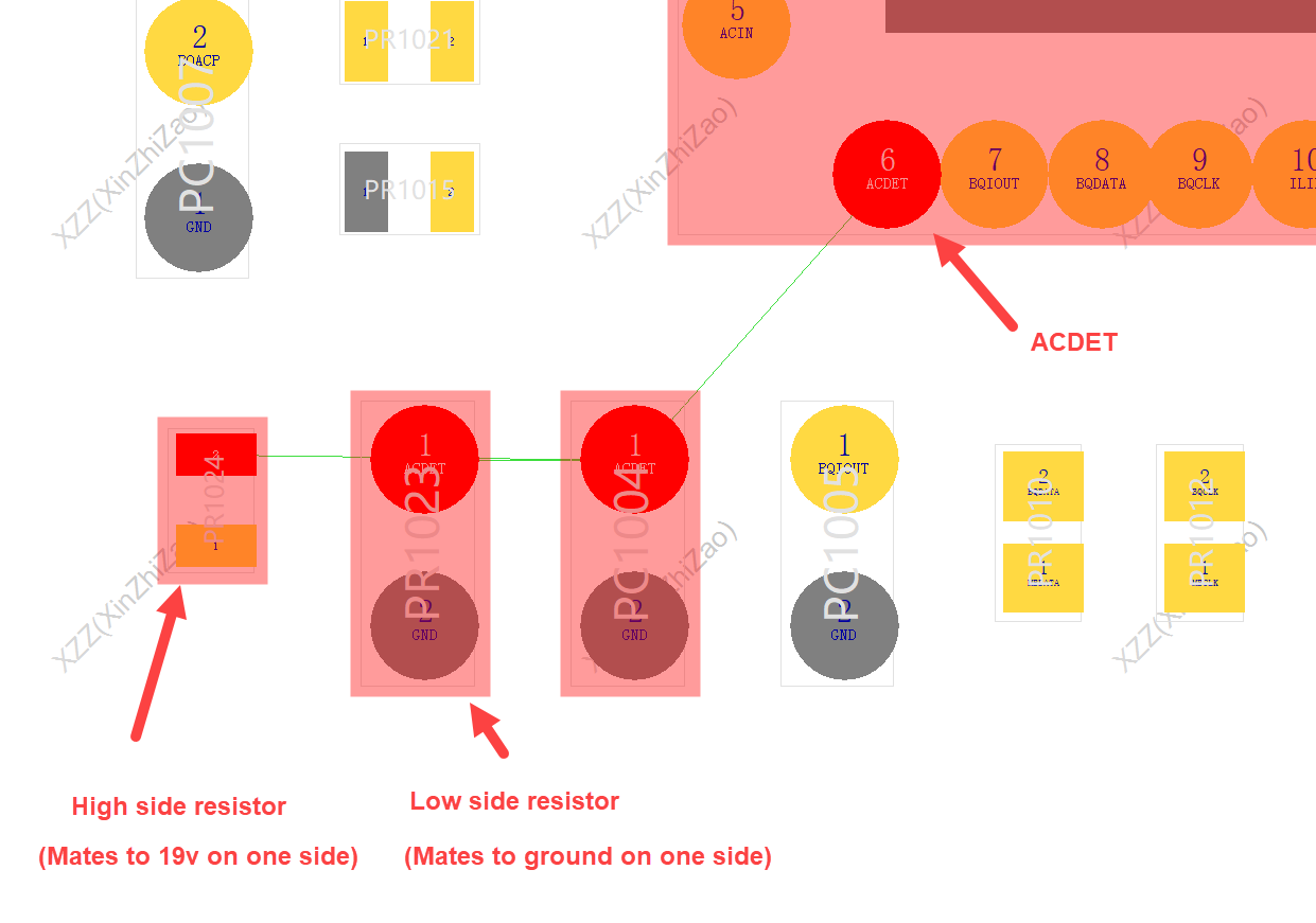 Carefully (!!!) measure the voltage to ground on the HIGH side resistor. We are wanting to confirm that the adapter voltage enters this resistor; at the common ACDET point is the divided voltage created by the high and low side resistors to scale to a safe value for ACDET. Given that ACDET is too low implies that the adapter voltage is lower and/or the voltage divider resistors may be faulty. It should be possible to adjust the resistors to yield an ACDET of 2v4 or slightly higher but not too high. Only then will the charger IC create the boosted gate voltage for ACDRV to enable the DCin mosfets in the power path and then your battery will charge once again.