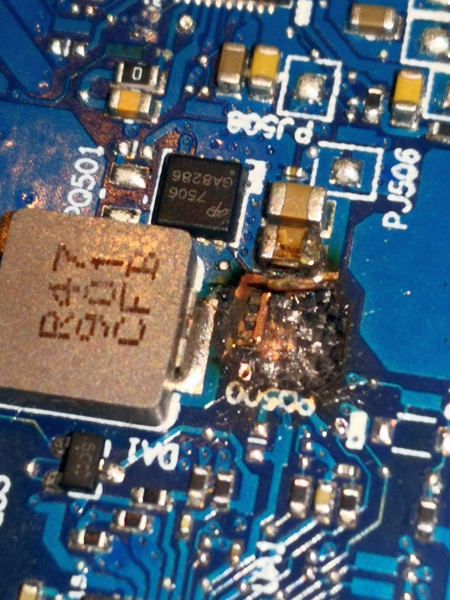 2) The high side mosfet @ PQ500 blew up for a reason. Clean up the region with IPA (medical grade alcohol - Costco pharmacy stuff is great) & cotton swabs / Q-tips.