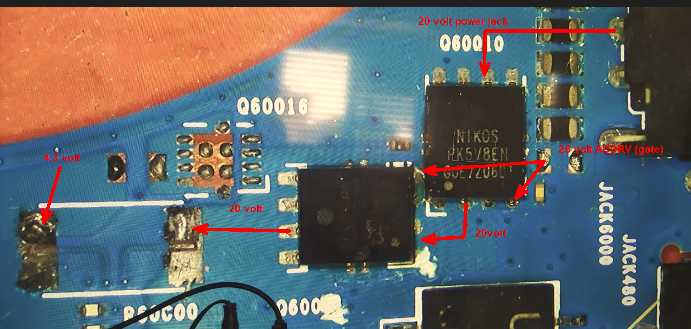 Some of the asus gaming boards wont work with bench PSU and there will be no 25V at ACDRV. When original adapter is used,ACDRV works fine at 25V. faced multiple times. So before experimenting,use a original charger first.