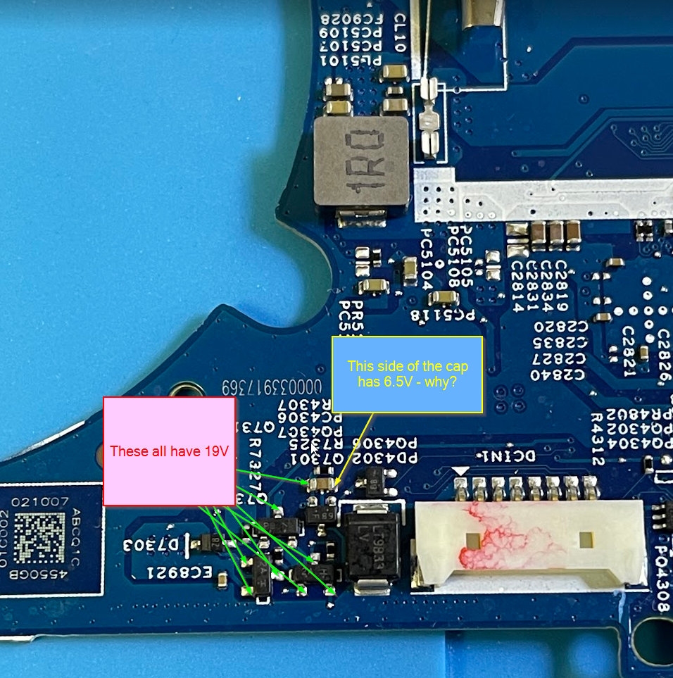 This device came in as no power. It is taking 0a current. I noticed a little liquid damage to the LCD connector and cleaned that off. I have 19v at the input mosfets, and on the opposite side of the board, there are several (diodes?) which all have 19v. There is a cap there which has 19v on one side, but 6.5v on the other - how?