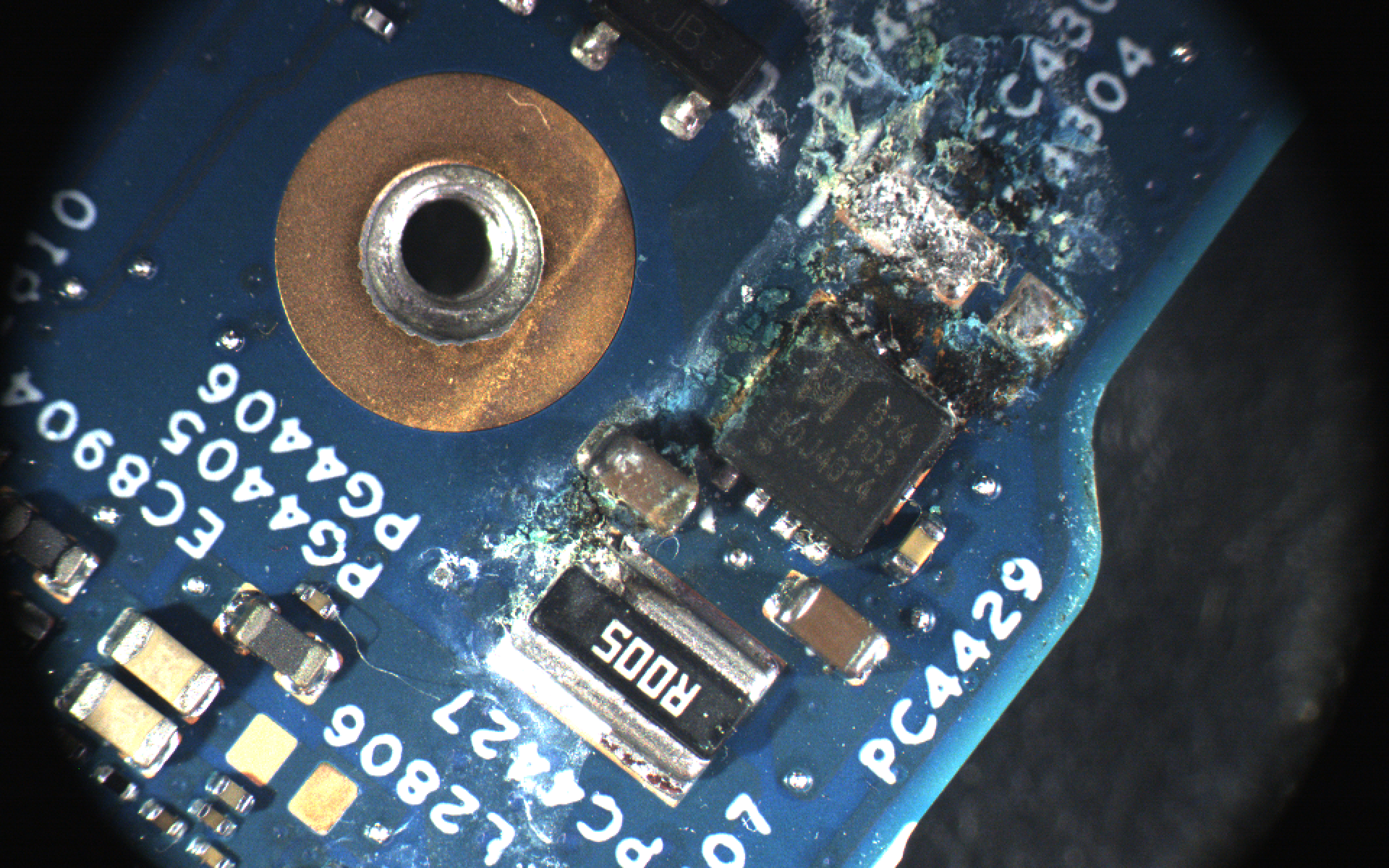 Attached are the images of the corroded P-Channel MOSFET area (which I've cleaned up) and the power regulation chip I can't identify.