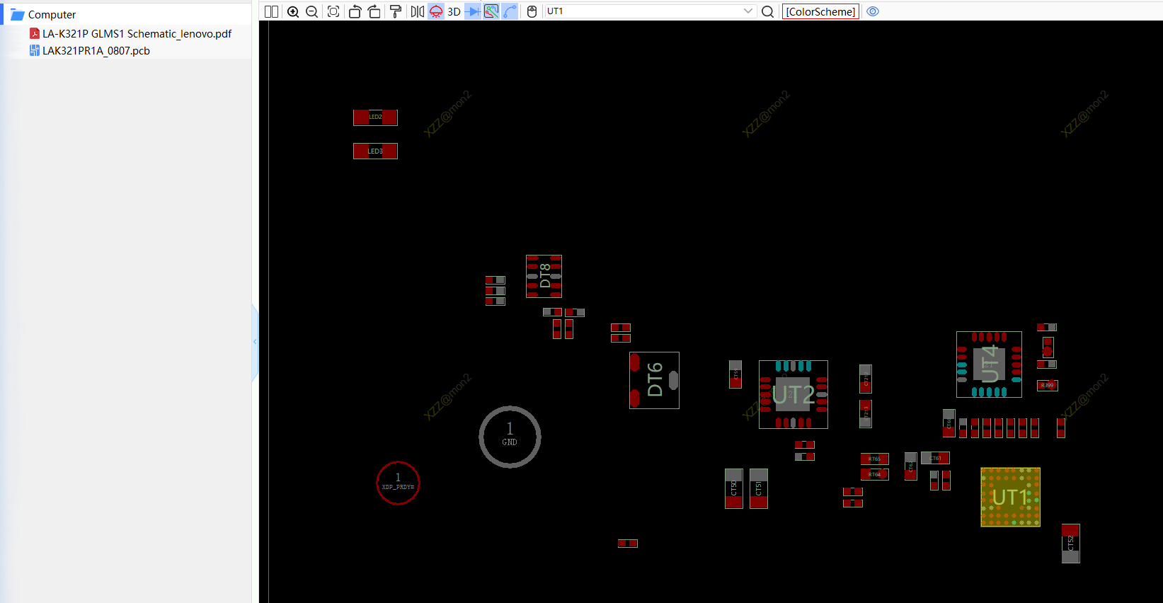 I have an LA-K321P board here that came to me for no power. Upon visual inspection of the board, I found some liquid damage around PQB13 area. Replaced PQB1, PQB2, and PQB13. Laptop will power on if the battery has a charge, but the computer will not charge the battery. USB Type C meter shows 20V being negotiated, but virtually zero amp draw (0.0100 at most that appears for a brief second about once every 5 seconds or so). Looking through thermal camera, UT1 (SN2001024YBGR) is getting hot. I have schematic, but no board view. Was hoping someone could help me get this charging