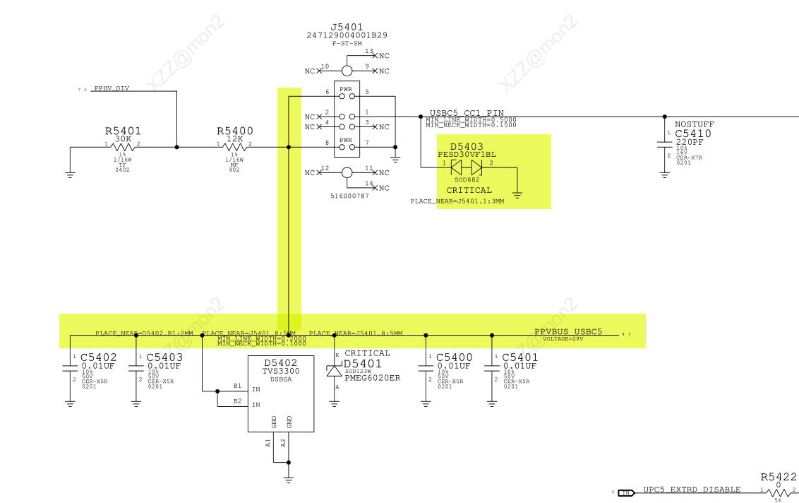 If the diode @ D5403 is damaged from an ESD event, then this resistance will be low and a defective diode will shunt the communication over this BMC line used for the power delivery contract. Under this condition, only 5 volt will ever be selected by power on default to power this logic board = too wimpy of a power rail.