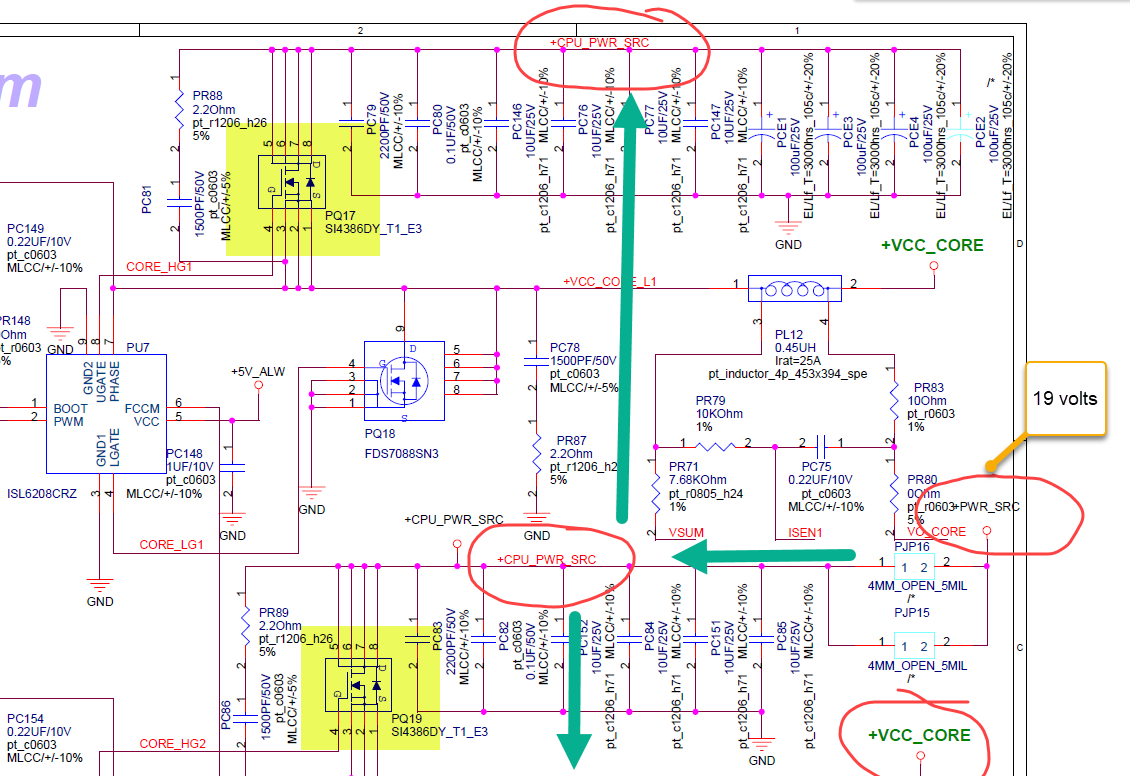 Confirm the power path from the main power rail (+PWR_SRC) to the VCORE rails.