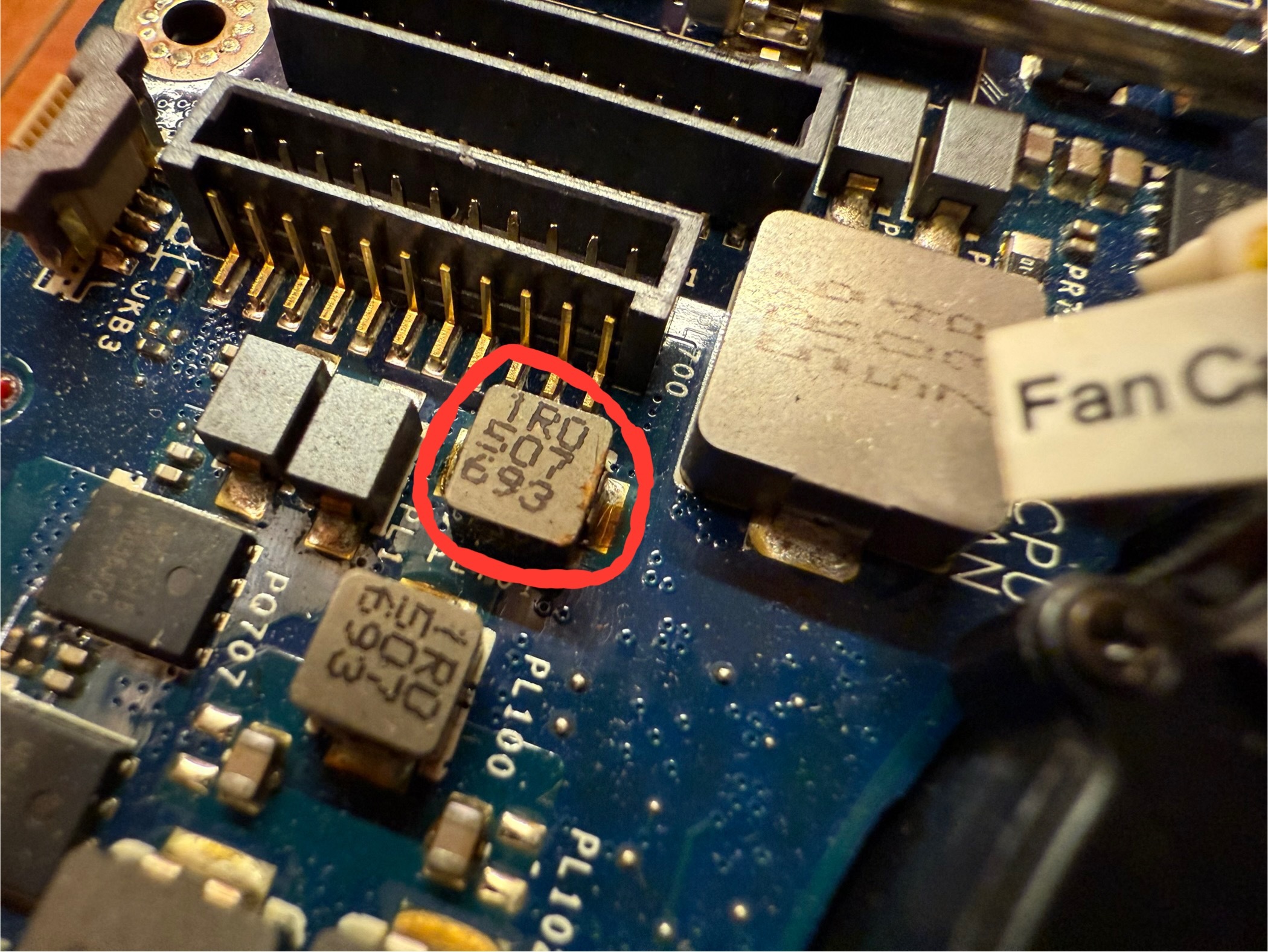 Additionally, I've disassembled the laptop and noticed an odd component that seems to be damaged. On the schematic, it's labeled as PL701, and it appears to be burnt. I've attached a photo of it as well.