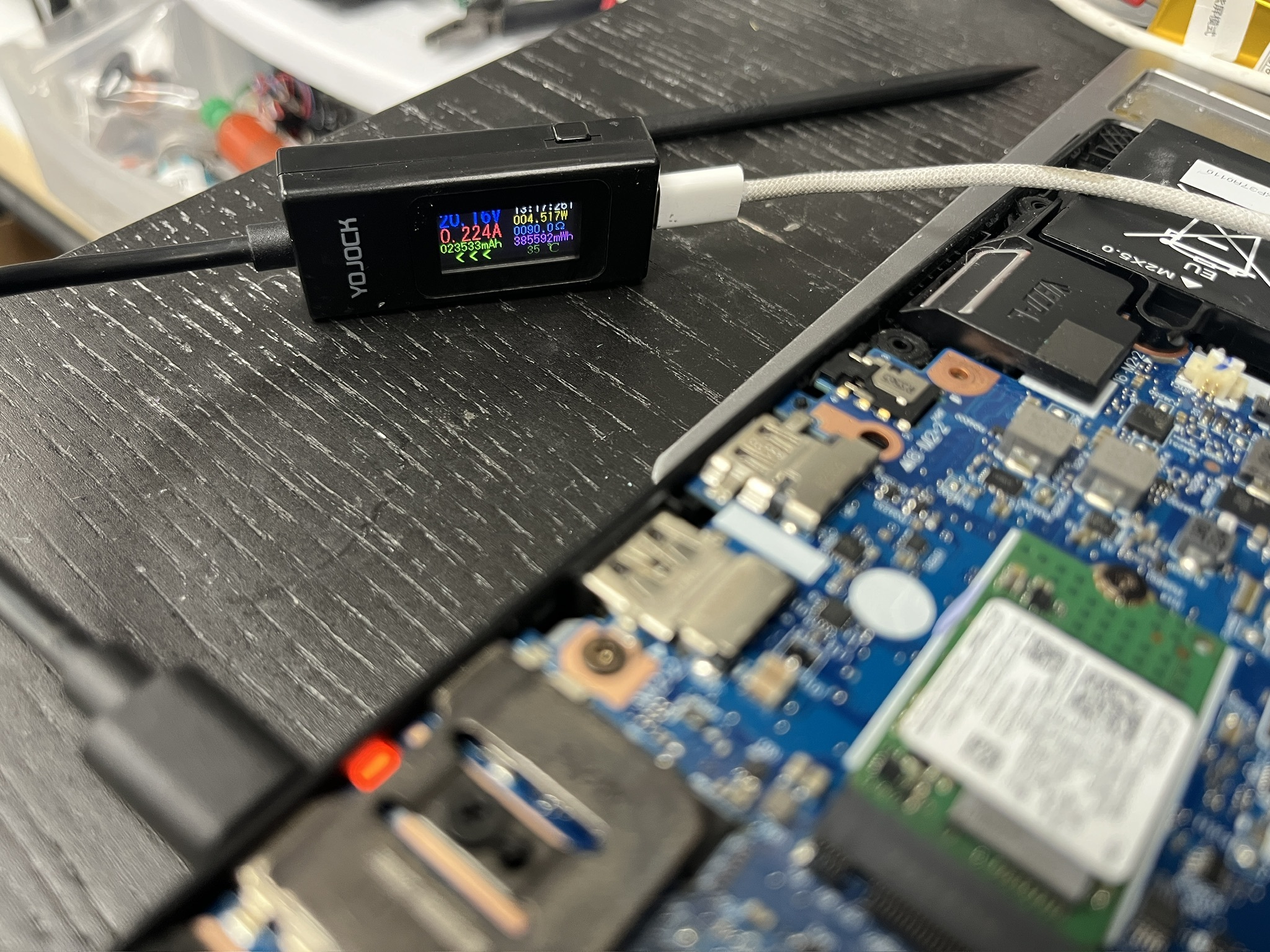I have a Lenovo here that does not want to power on. The motherboard appears to be clean, no sign of corrosion or obvious fried components. When plugged in, I see 3 blinking lights and then off. It would cycle the 3 blinking lights every 10 seconds or so as long as I have the adapter plugged in. Amp meter shows 20 volts, 0.224 amps, no fan spin, red light indicator near the charge port.