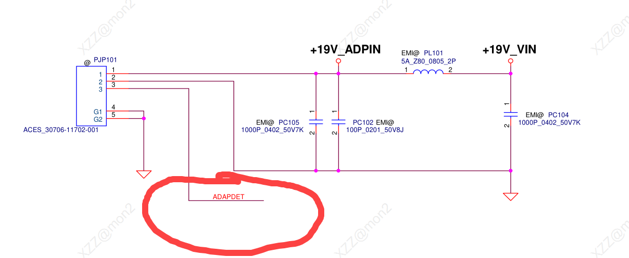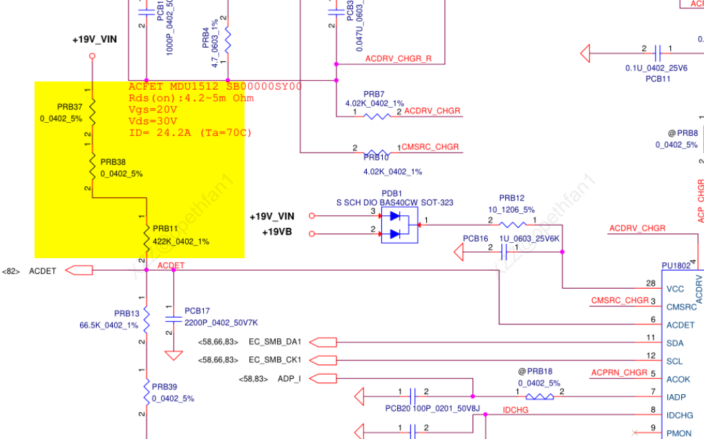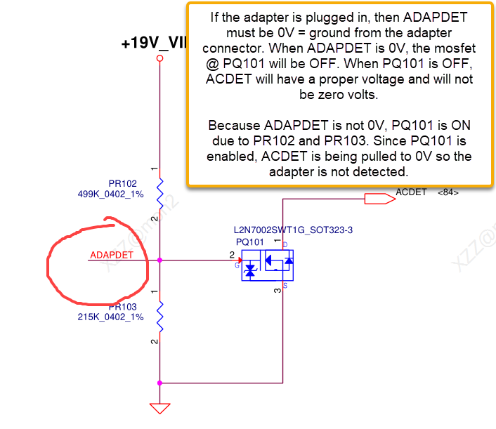 Confirm the voltage on each of the 3 resistors on ACDET (highlighted in yellow).
