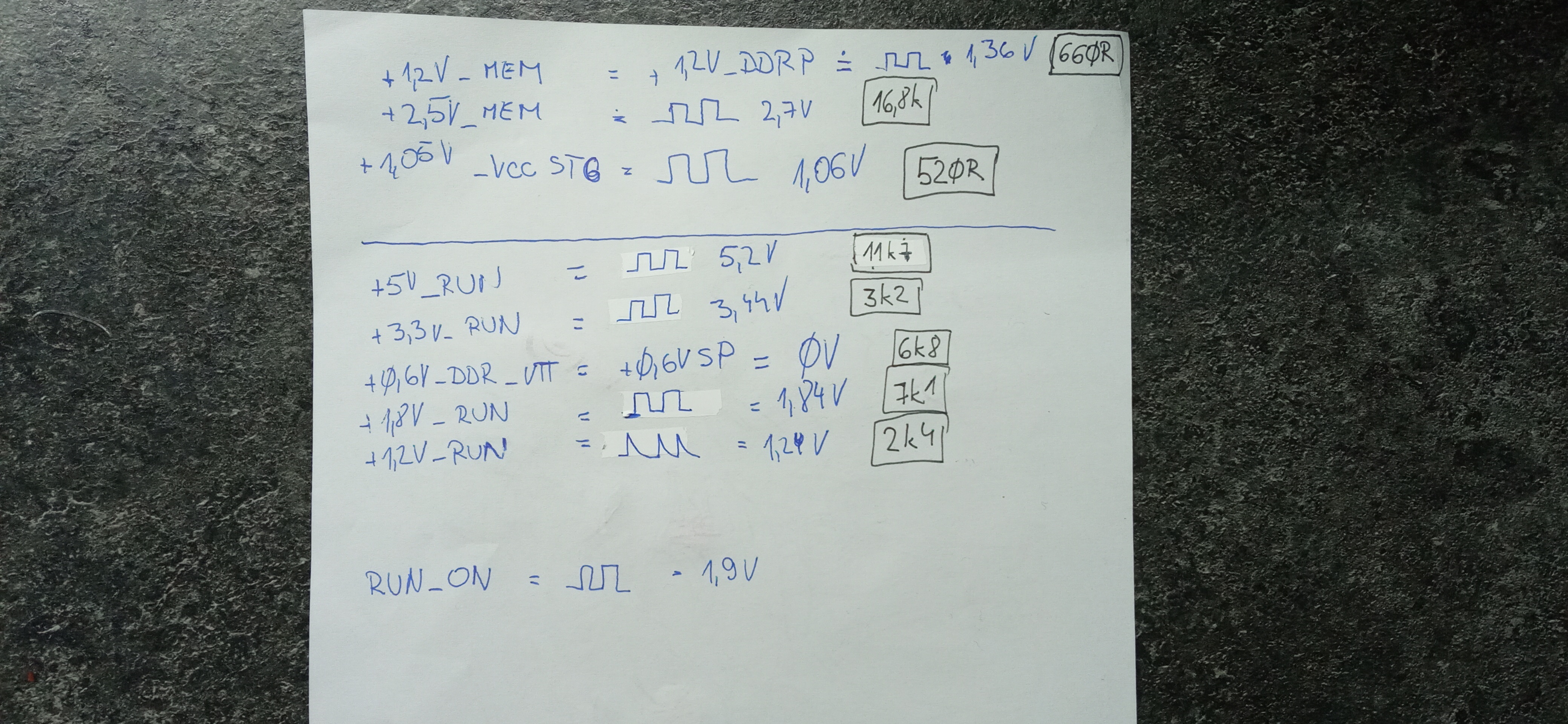 All selected power rails are fluctuating, see attachments. Only +0.6V_DDR_VTT is 0V. Resistances seem fine to me. Actually all enabled signals are fluctuating, obviously ( RUN_ON for example 0-1.9V ).
