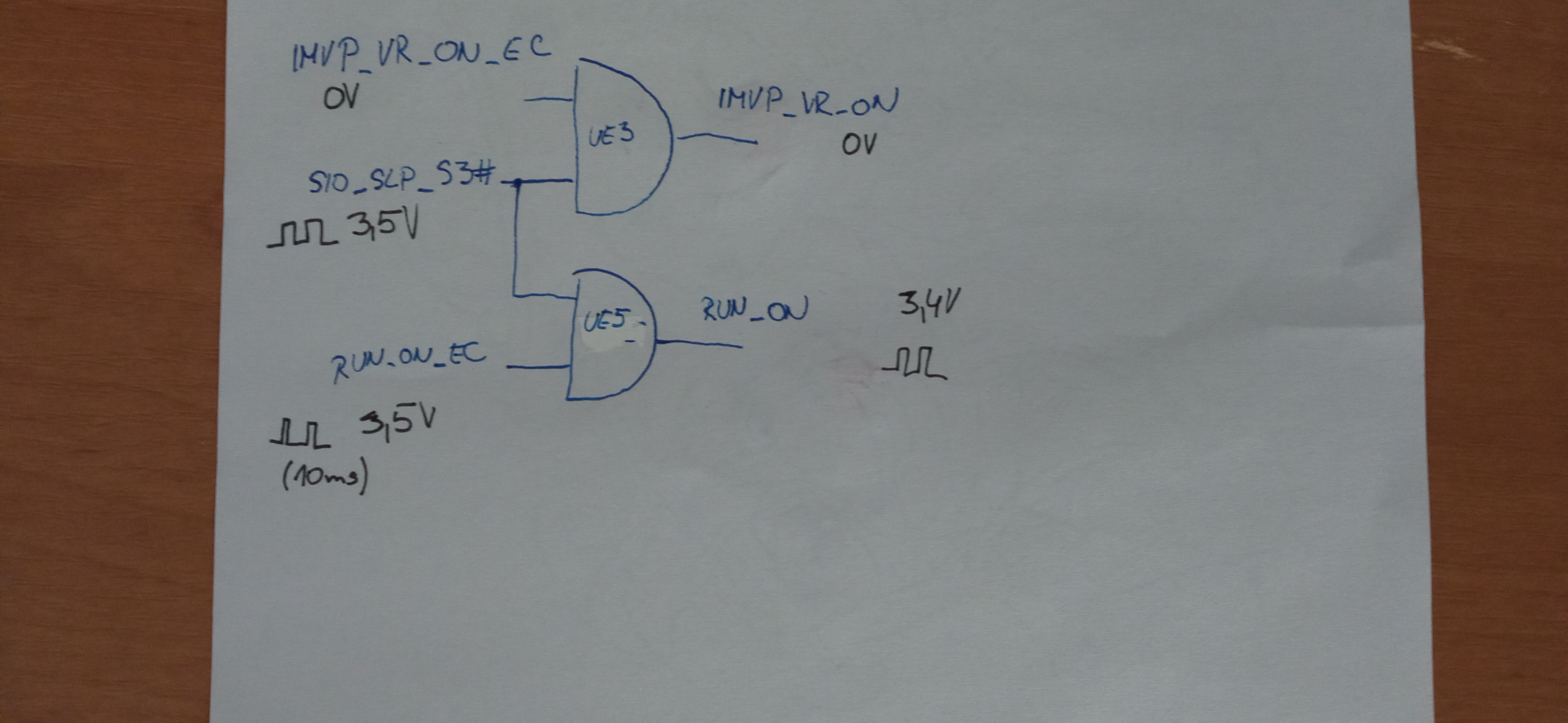 CPU coils are all time low, VR_ON, I found only IMVP_VR_ON ( is it it? ), and it is at 0V. RUN_ON is fluctuating at 3.4V, SIO_SLP_S3# is also fluctuating at 3.5V. See the attachment.