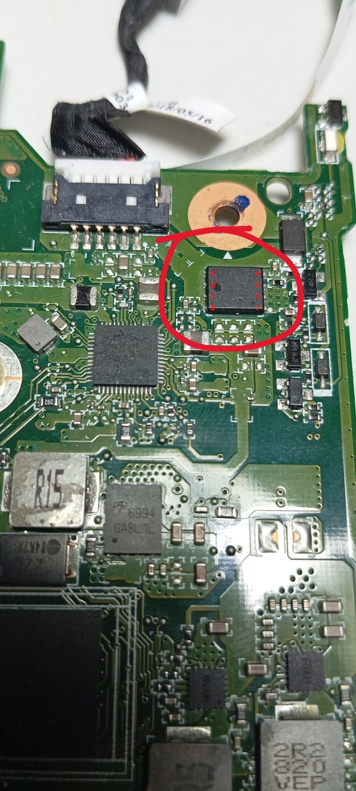 I've been still checking the motherboard, and I've found that there's an 8-pin mosfet close to the DC in power connector that has 19.81 VDC on its Drain (5-6-7-8) and Source (1-2-3 pins), BUT the voltage on the Gate (pin 4) is 25 VDC. Is that normal? I'm suspecting on that mosfet since there are few components close to it that don't have voltage at all. The printed code on that mosfet is totally unreadable, so I can't tell which voltage is good and which is bad. Can anyone give me a hand on this?