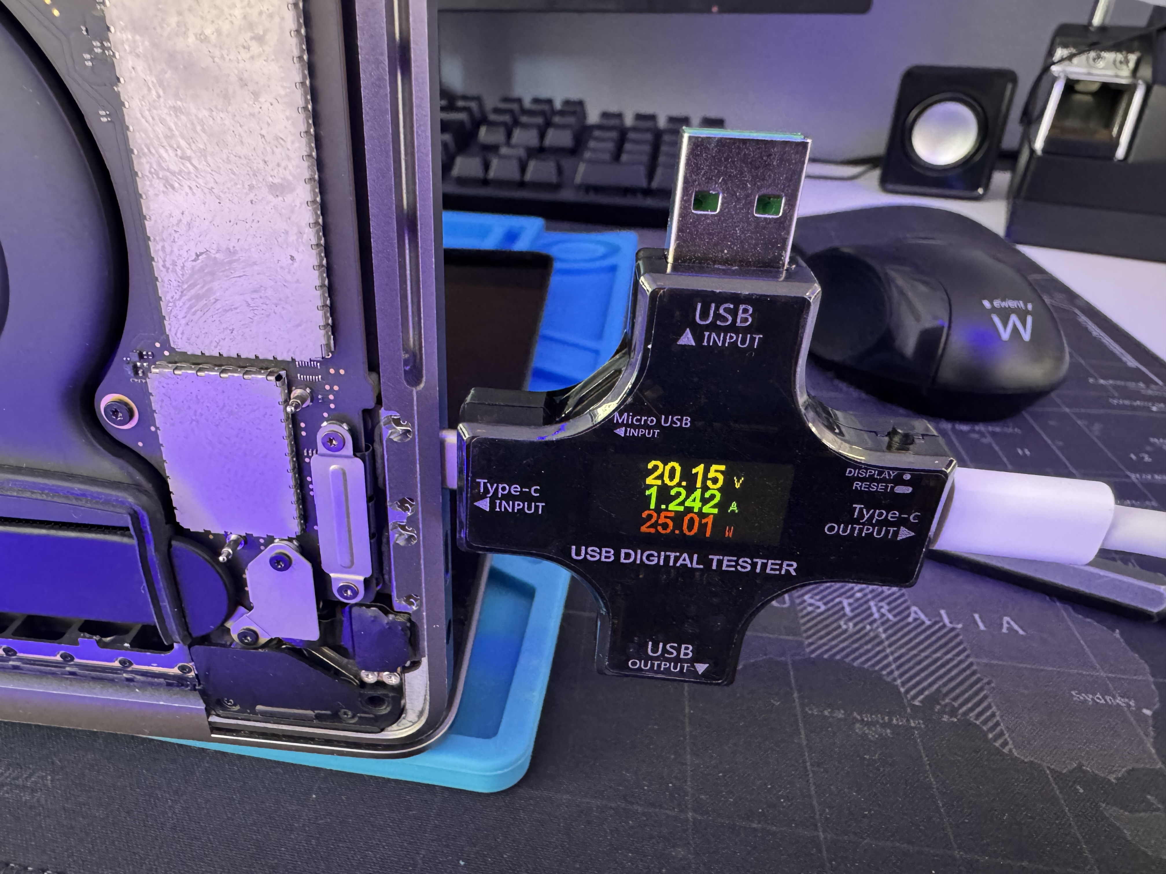 I have this macbook that is behaving abnormally. Initially it had a battery life problem, after changing the battery everything seemed ok, but after about 5 days it started giving problems. It turns on once in 10 (or maybe more), more often after I unplug the battery connector and plug it back in. Sometimes after SMC reset. But it's not a stable rule. Visual inspection shows no problems, no signs of liquid contact or burning. Looking with the thermal camera I notice that the chip that heats up the most is U7220.