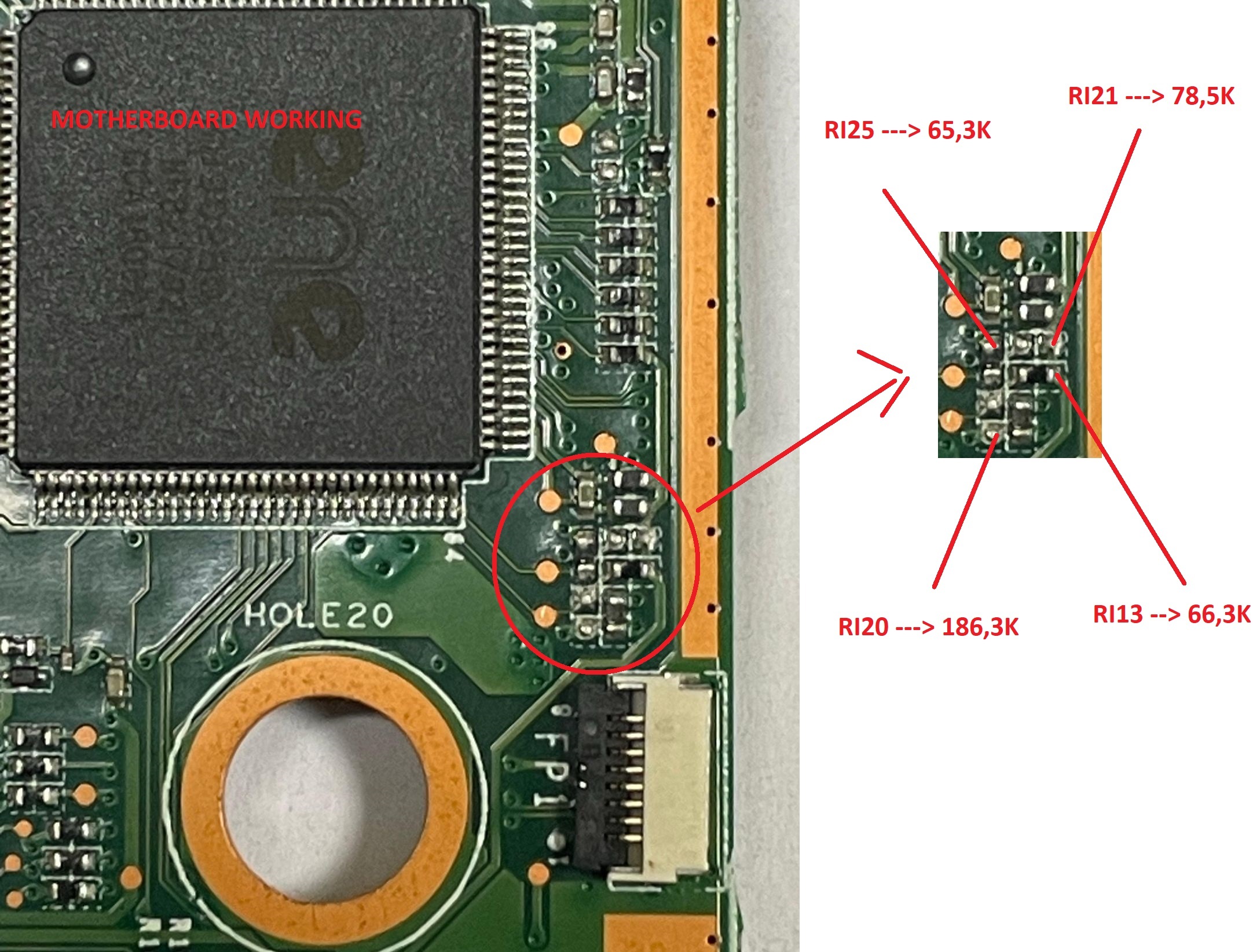 here are the measurements between the broken motherboard and the new one, I can see (photo) that between the two motherboards the resistors are positioned differently: