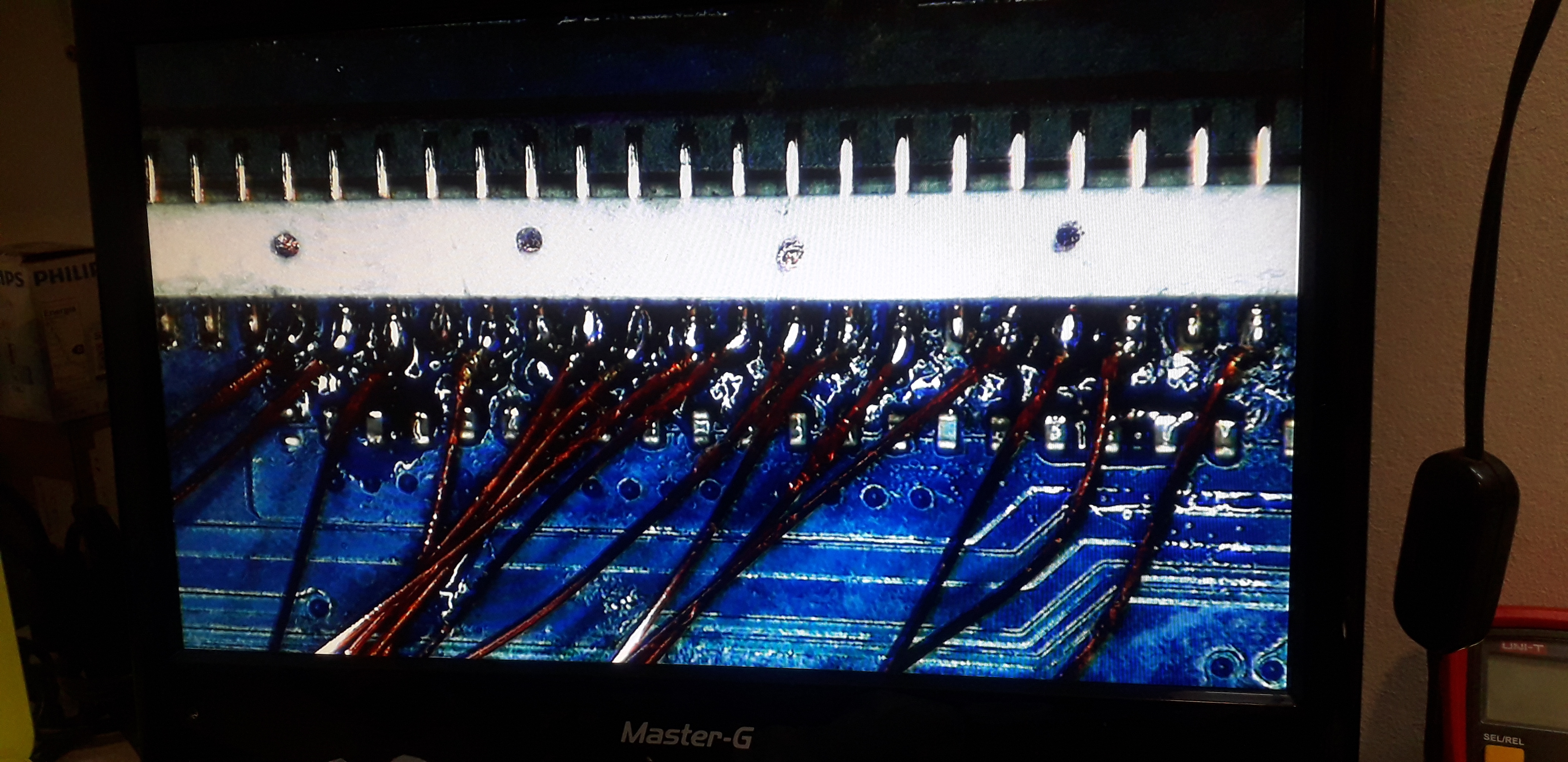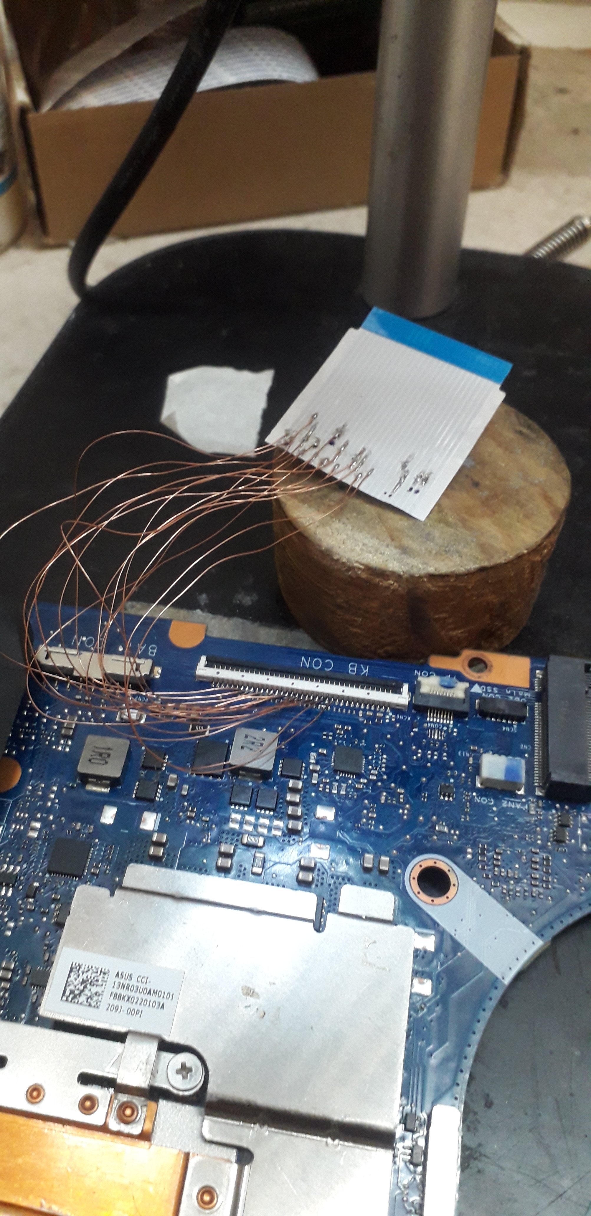 So, with the soldering station at 390° and 75% air, I removed the KBC and inserted the replacement. I also re-soldered the KR1 resistor to power the KBC. It was time for the crunch, and the computer responded, of course not as I expected, but at least there were signs of life: the power LEDs and the battery were on. I tried to turn on the board with the power button, but it didn't respond; it clearly had a different firmware or simply didn't have it. I had to program it. PROGRAMMING THE IT8987VGA WITH RT809F AND PEB1 Programming the KBC requires a bit of work, but it's not complicated. You just have to pay close attention to the pins on the motherboard's keyboard connector, where each of the lines we'll connect to the adapter and PEB1 of the RT809F programmer should go. The lines are as follows: