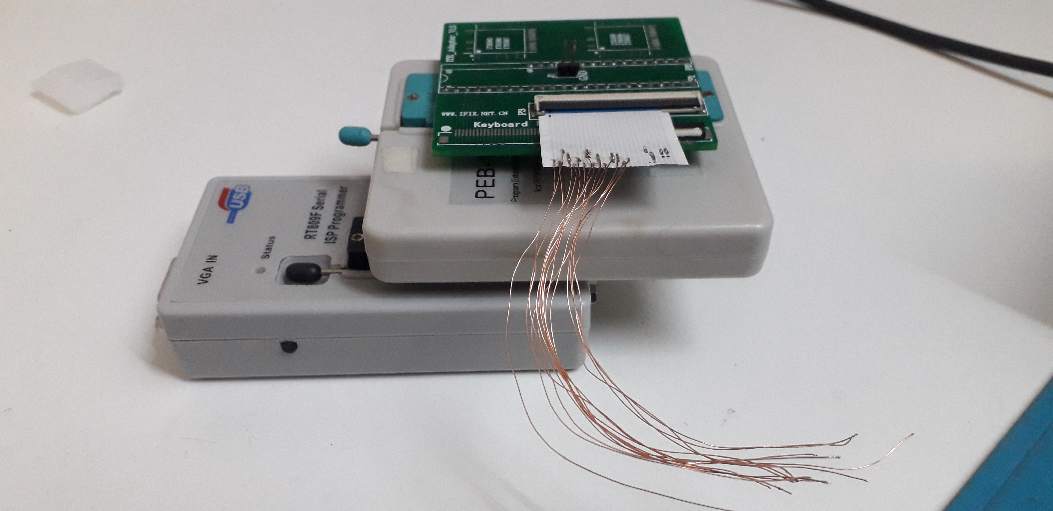 I didn't use line 12 of the flex cable that goes to PEB1 of the RT809F because it was damaged, but you could use it, or use a flex cable that specifically adapts to the motherboard's keyboard connector and the PEB1 adapter connector. You also need to connect the PEB1 adapter's GND to the motherboard's GND. That's all. Once the board is powered up, you should be able to read the IT8987VG with the RT809F software. In the RT809F software, you need to manually specify a couple of things.